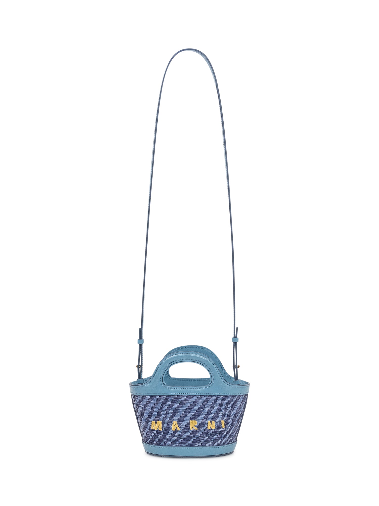 Micro bag with structured shape and integrated top handle, woven body with graphic pattern and embroidered logo on the front. Compact design ideal for summer occasions.