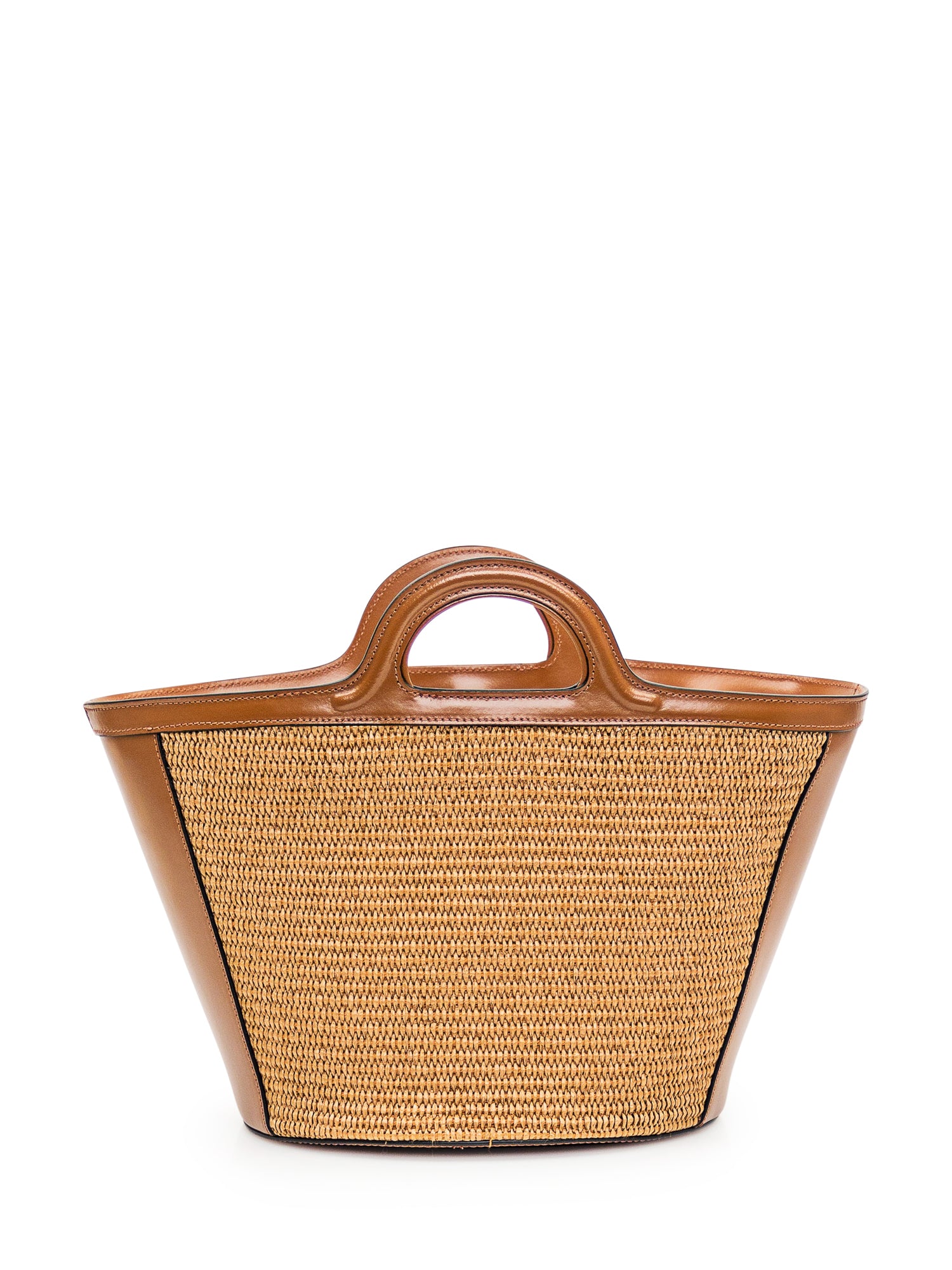 Brown raffia bag. Two handles. Removable and adjustable shoulder strap. Inside pocket with zipper. Embroidered logo on front.