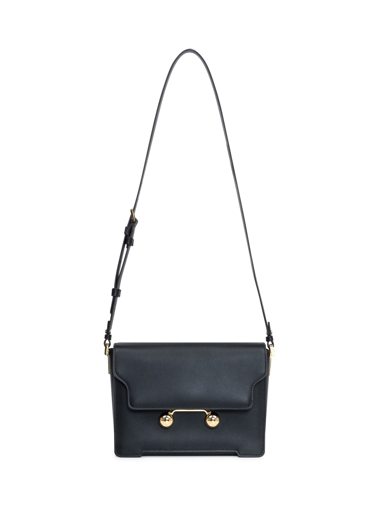 Calfskin leather medium shoulder bag. Magnetic flap closure. Adjustable and removable shoulder strap. One compartment with inside pocket. Nappa leather lining. Engraved Marni lettering detail and two metal half spheres on front.