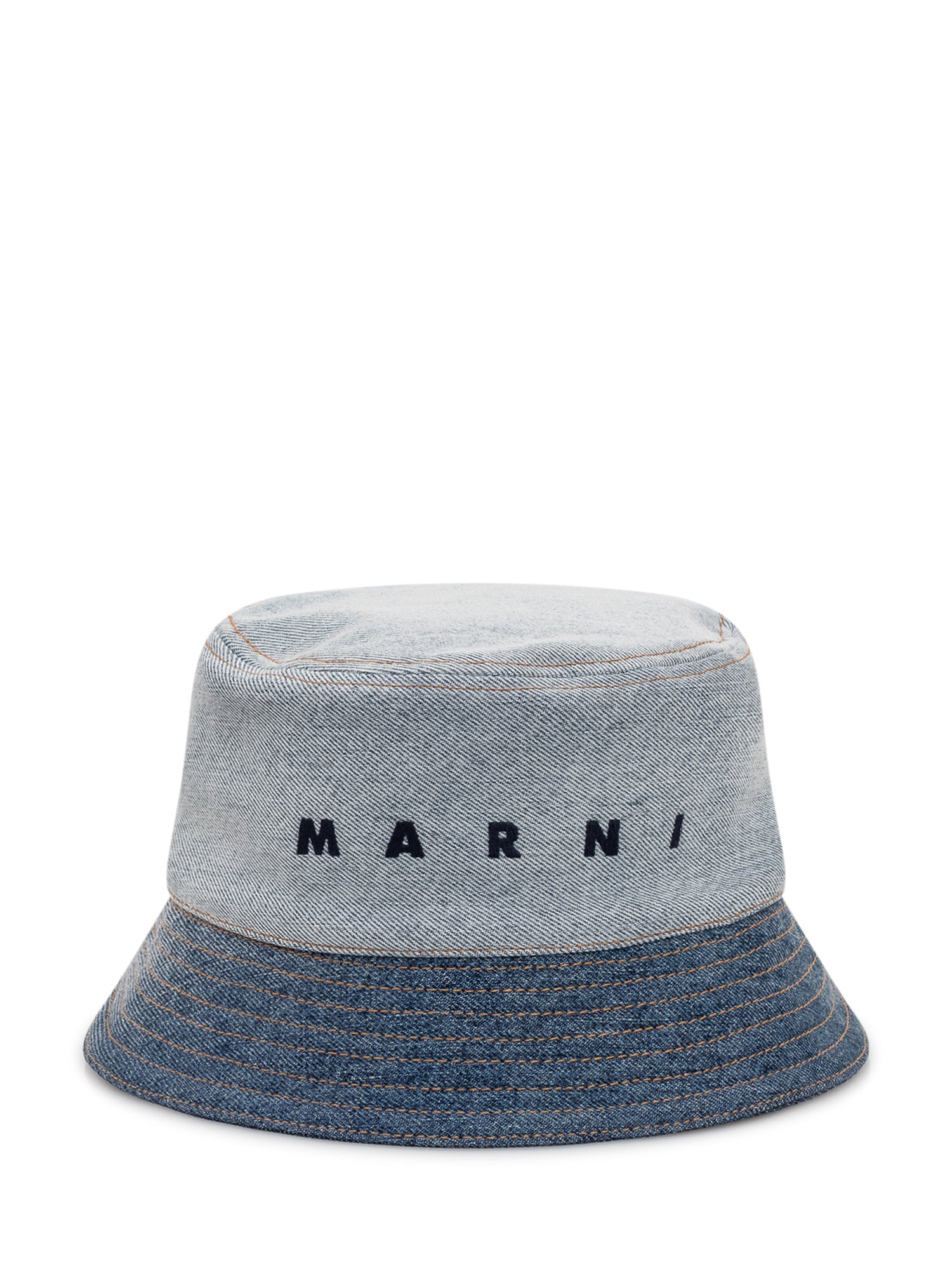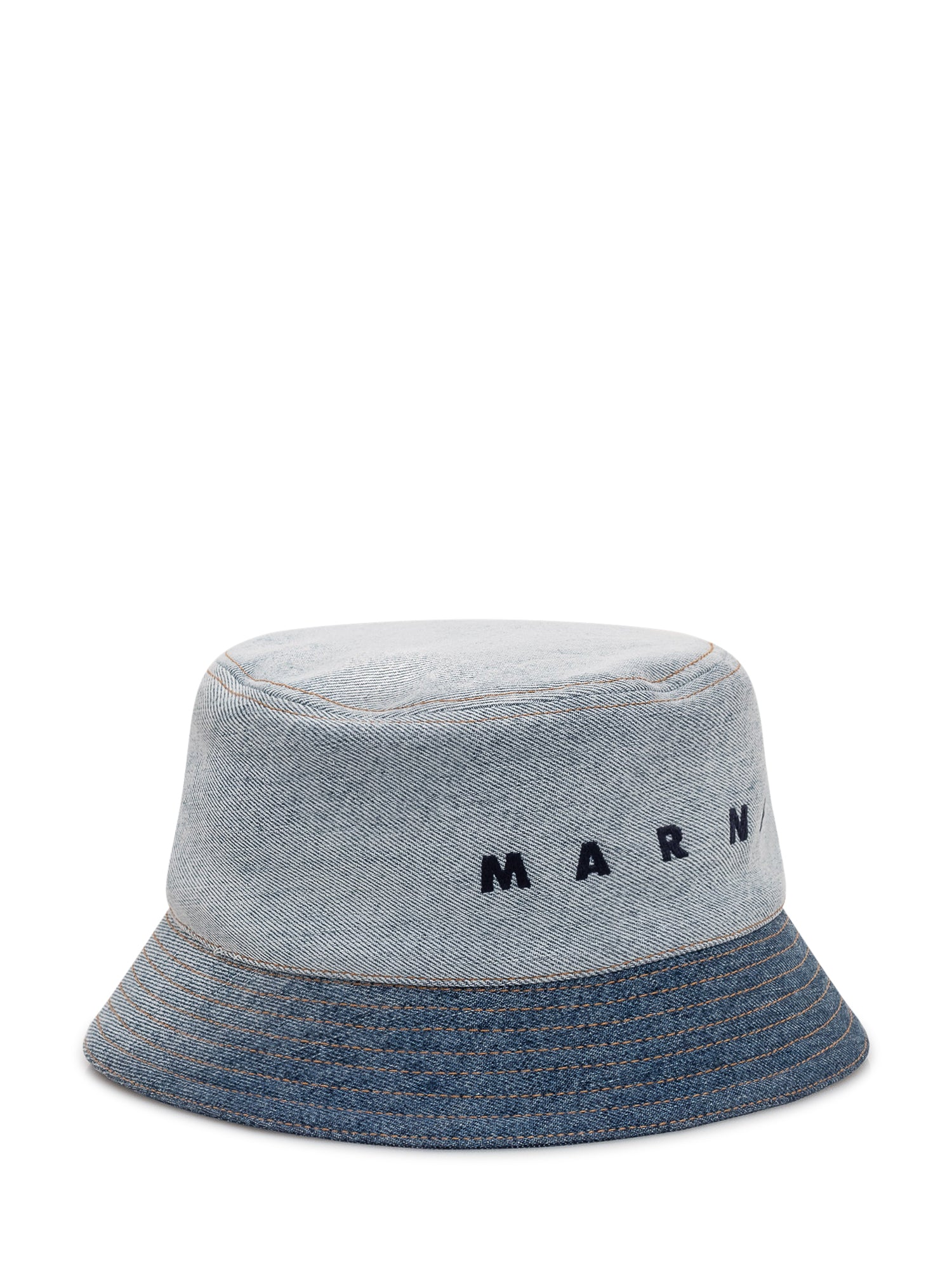 Bucket hat in denim with short brim and visible stitching, embroidered logo on the front and soft structure. Versatile accessory ideal to complete casual outfits.