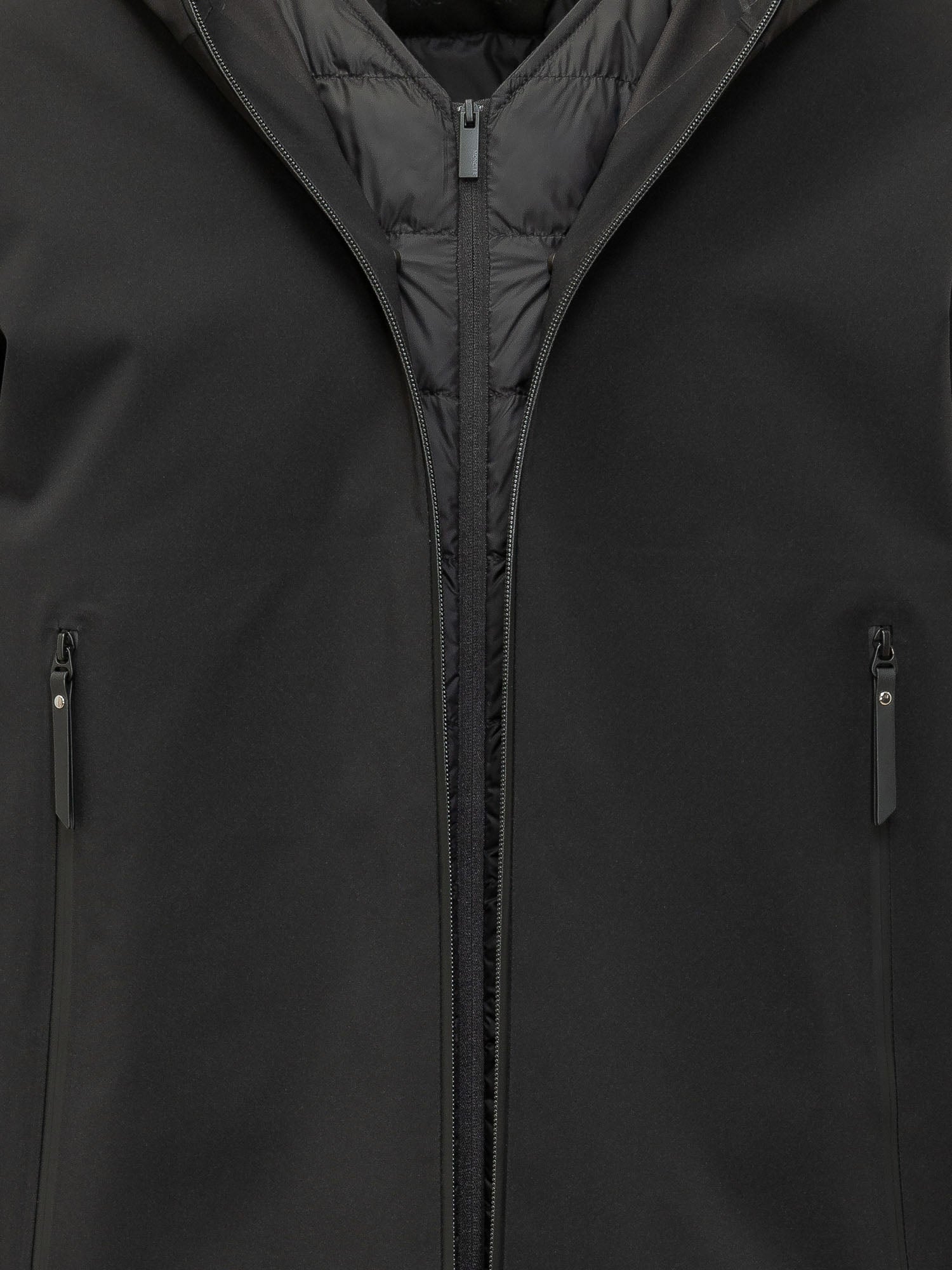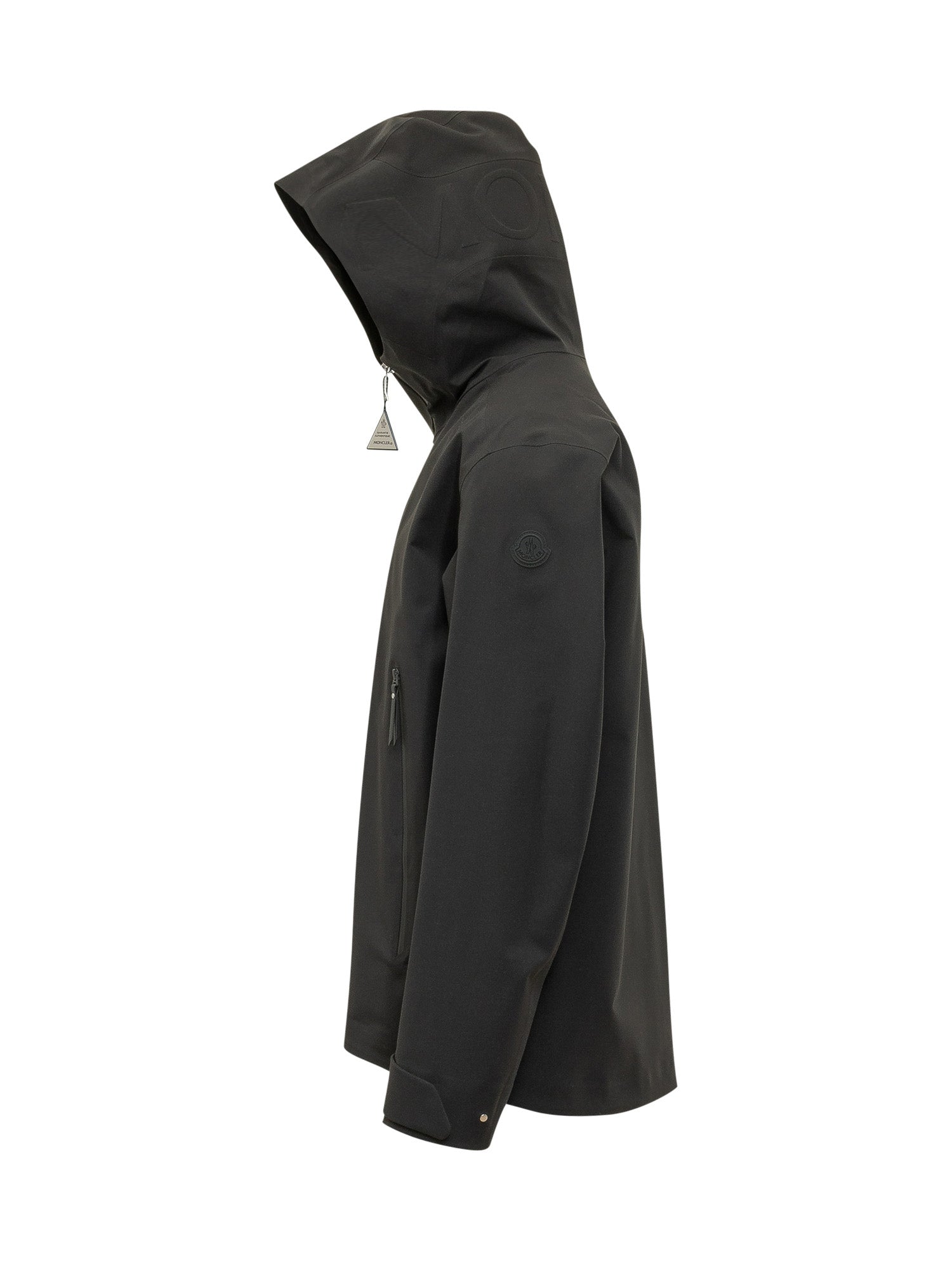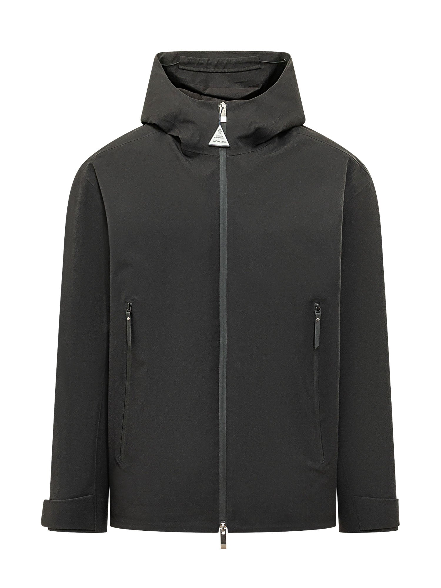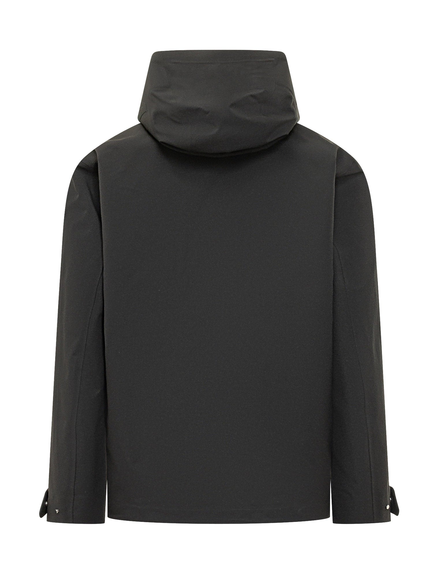 Minimal, technical hooded jacket with a clean silhouette. Features a two-way front zip, zipped side pockets, and adjustable cuff tabs.