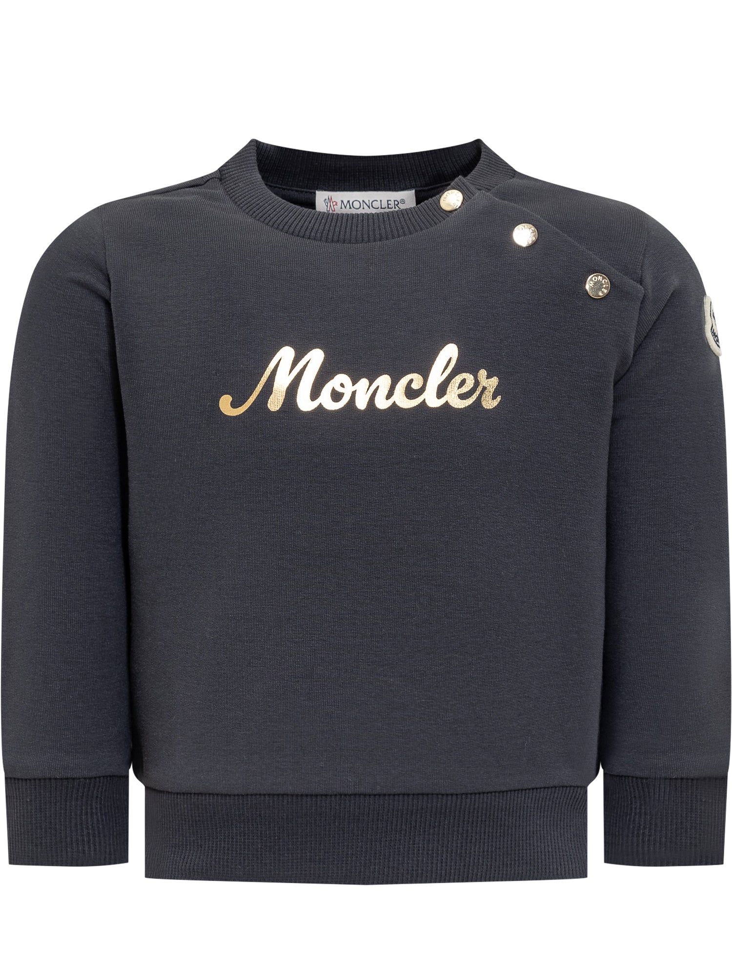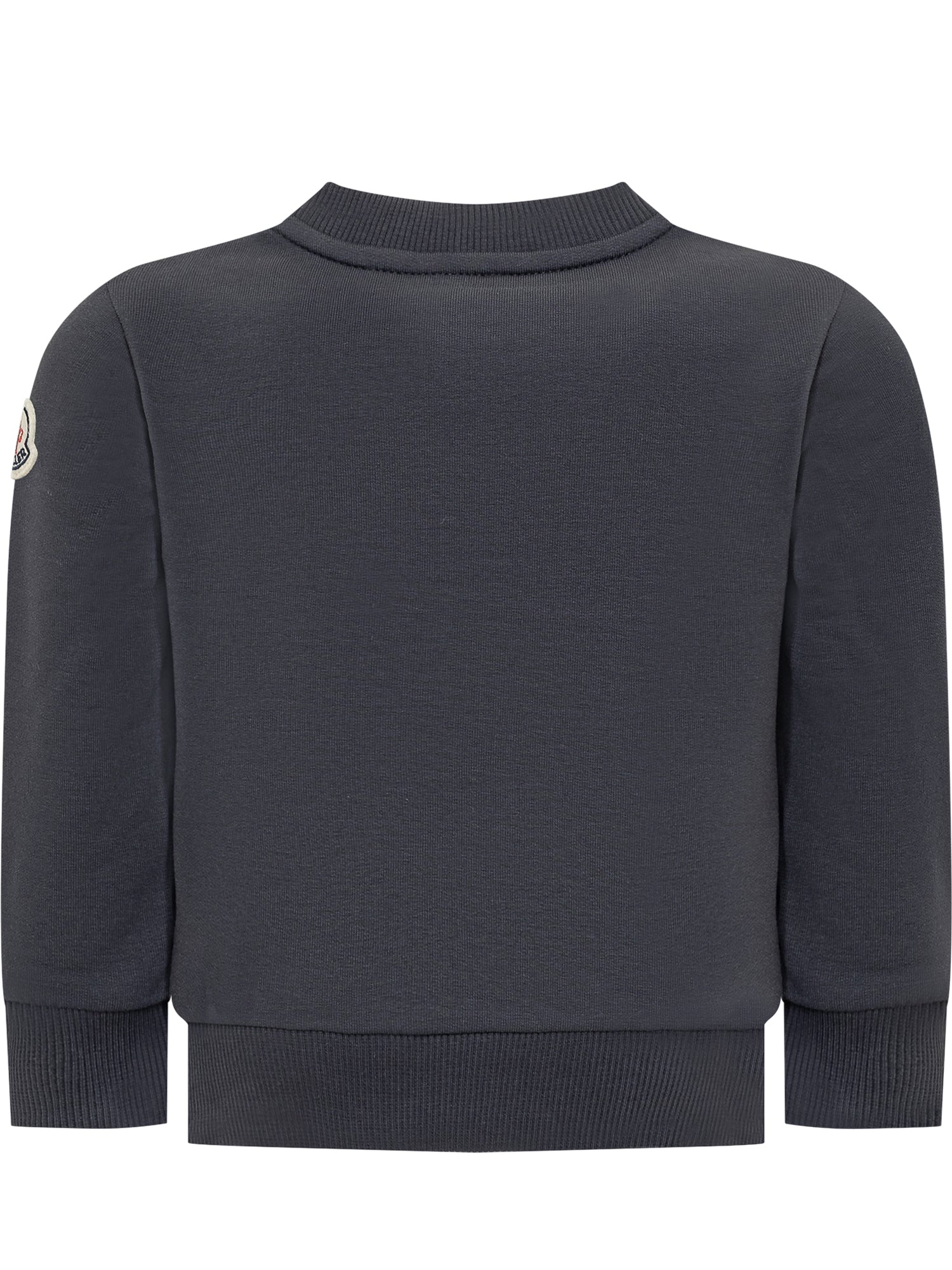 Long-sleeved sweatshirt. Crew neck. Ribbed hems. Buttons on shoulder. Logo printed on front with patch on sleeve.