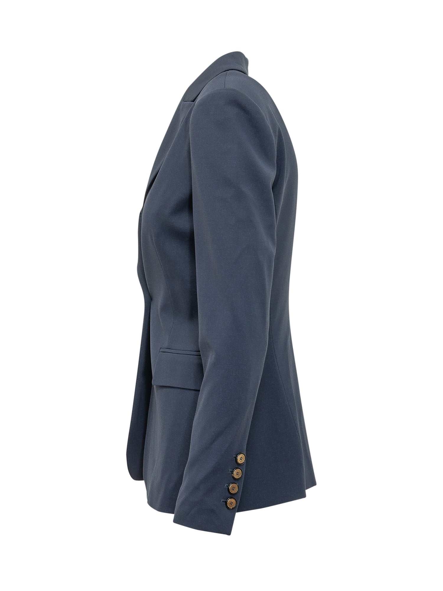 Womens tailored jacket with classic lapels, single button closure, flap pockets, structured shoulders, fitted line and regular length.