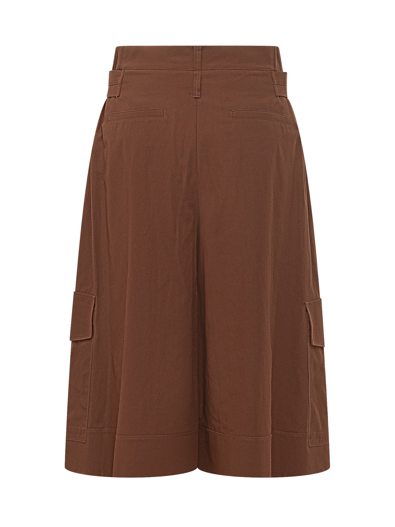Bermuda shorts with front button closure and matching belt with buckles. Applied side cargo pockets with flap and button. Wide leg and knee length for a structured look.