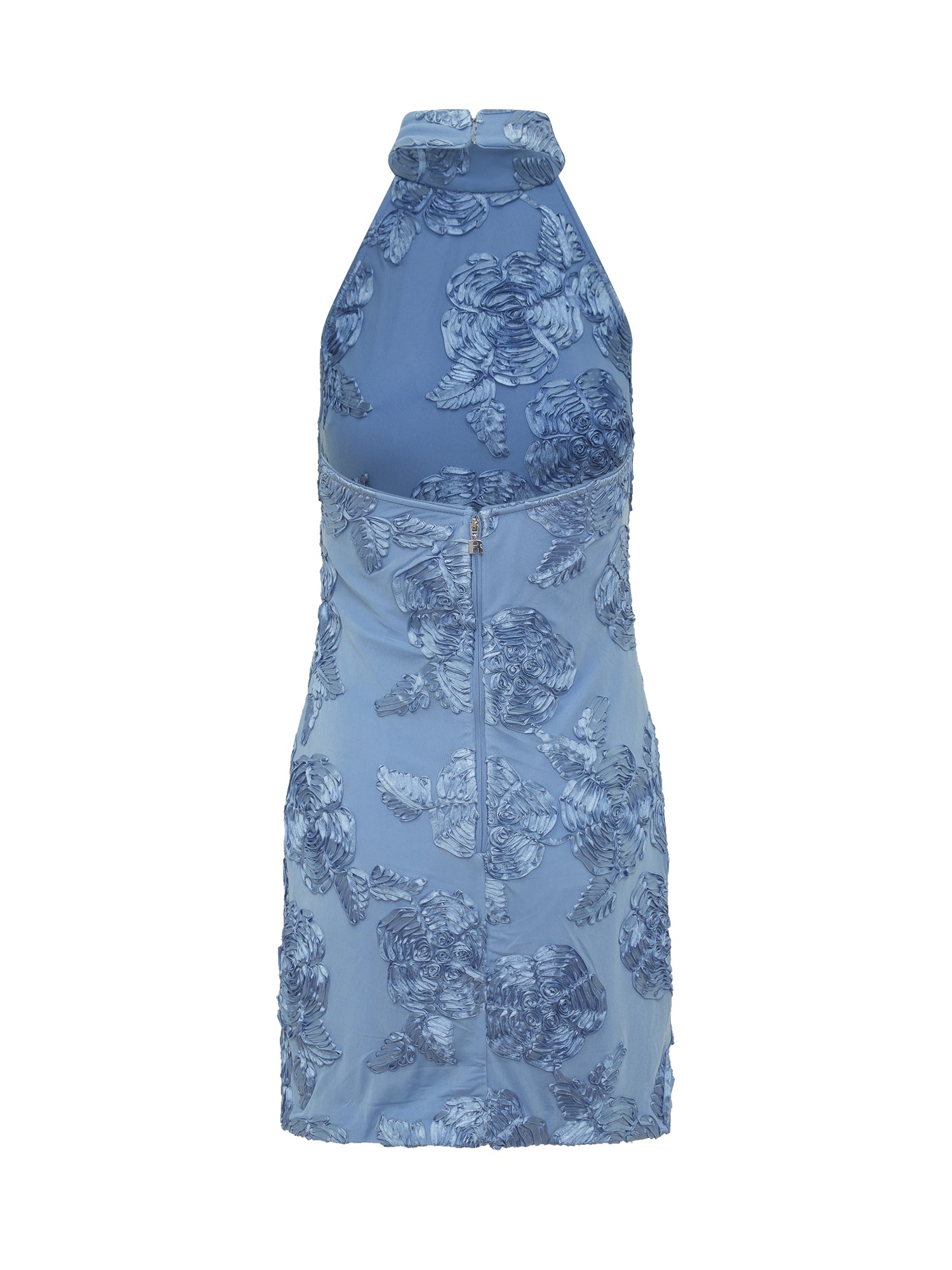 Halterneck dress with three-dimensional floral embroidery for added texture and refinement. Its fitted silhouette enhances the figure.