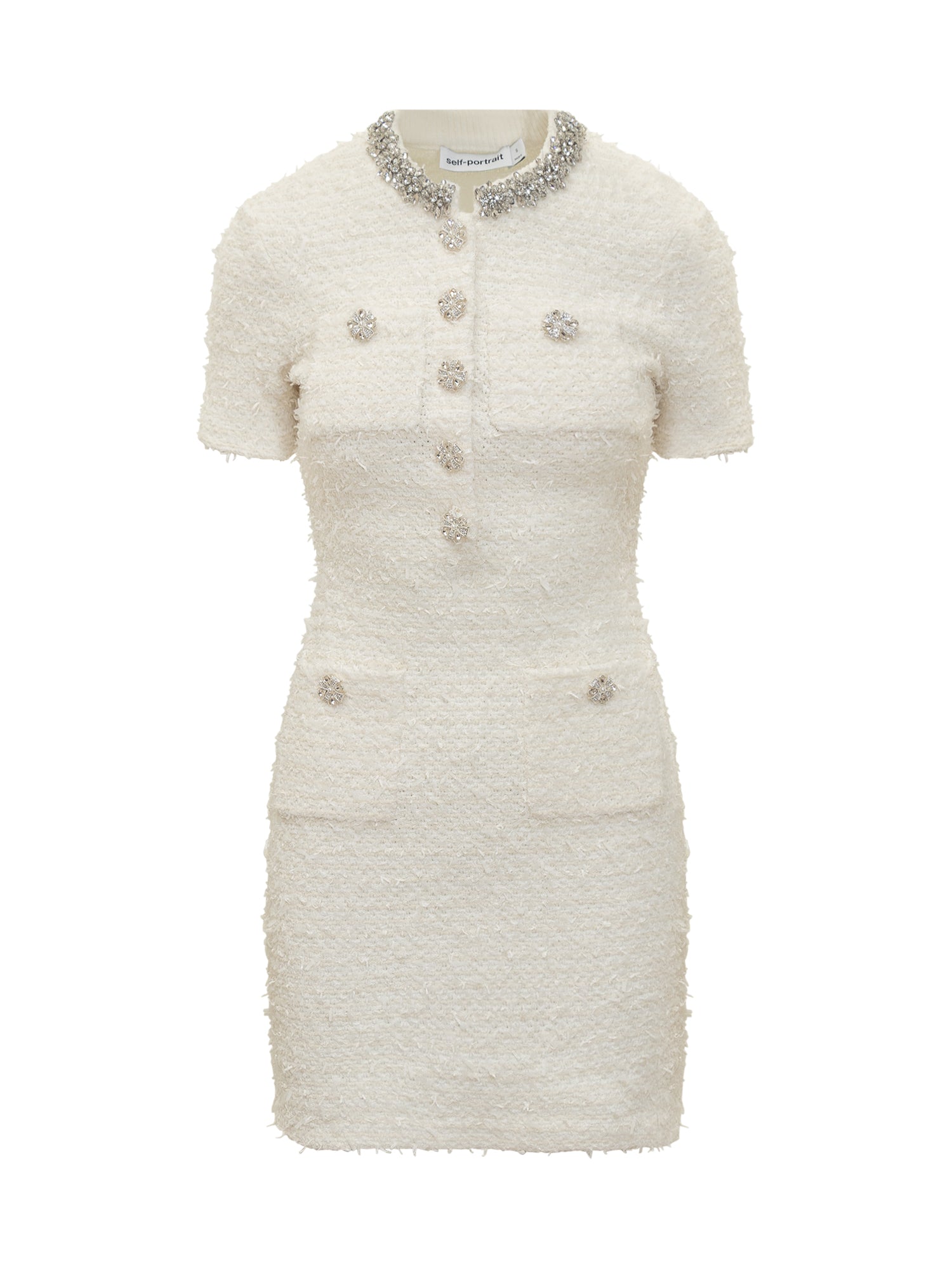 Ivory boucl\u00E9 mini dress with short sleeves, jewel buttons and crystal-embellished neckline.