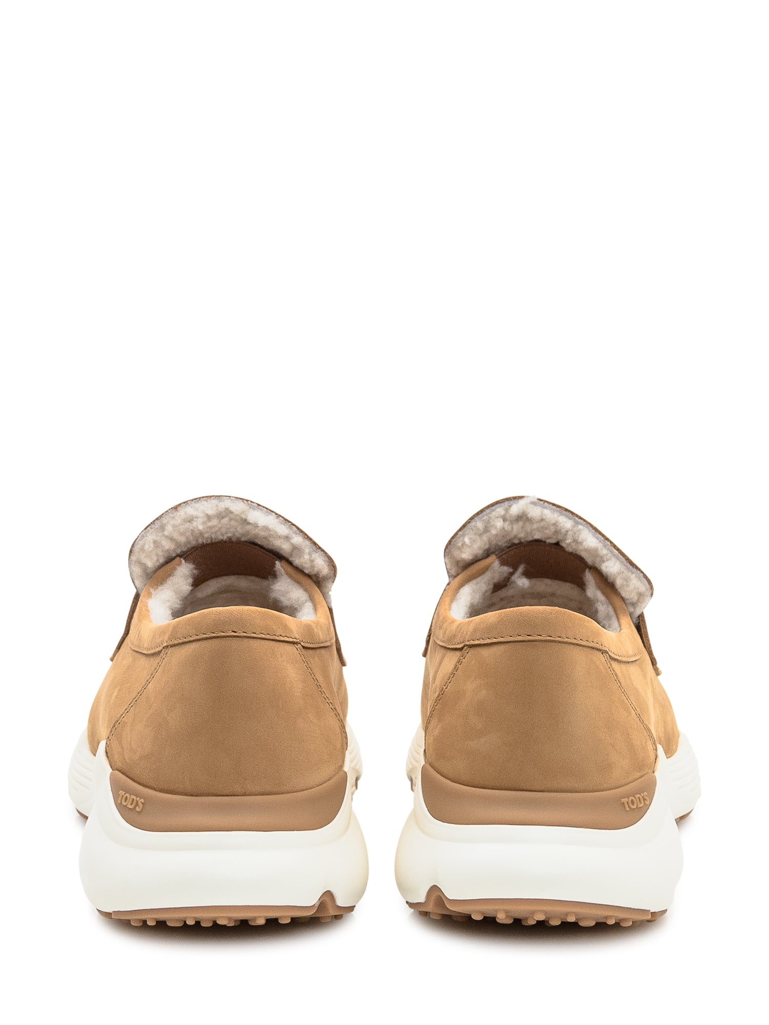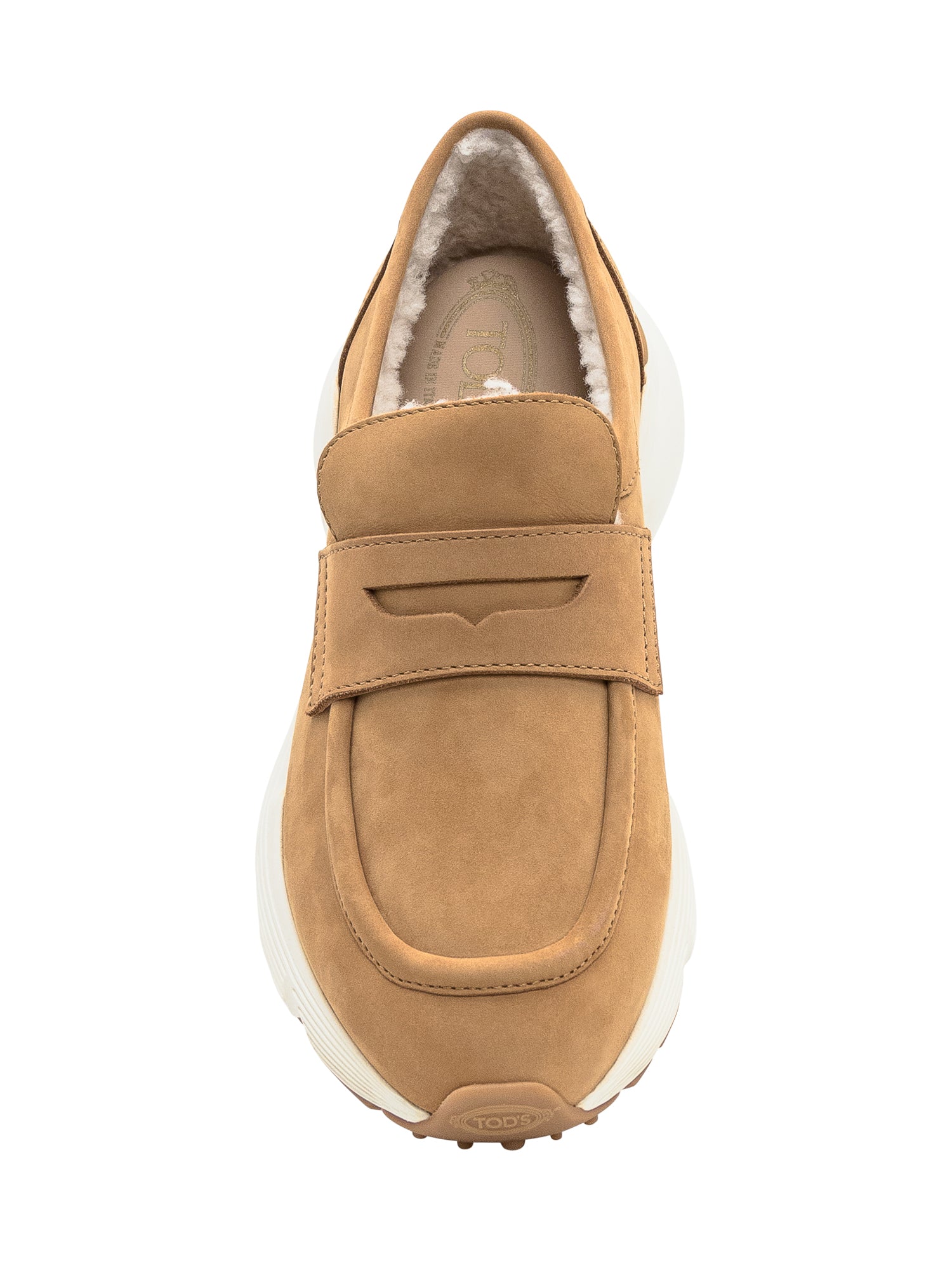 Tod's loafers in camel suede with shearling lining and contrasting white platform sole.