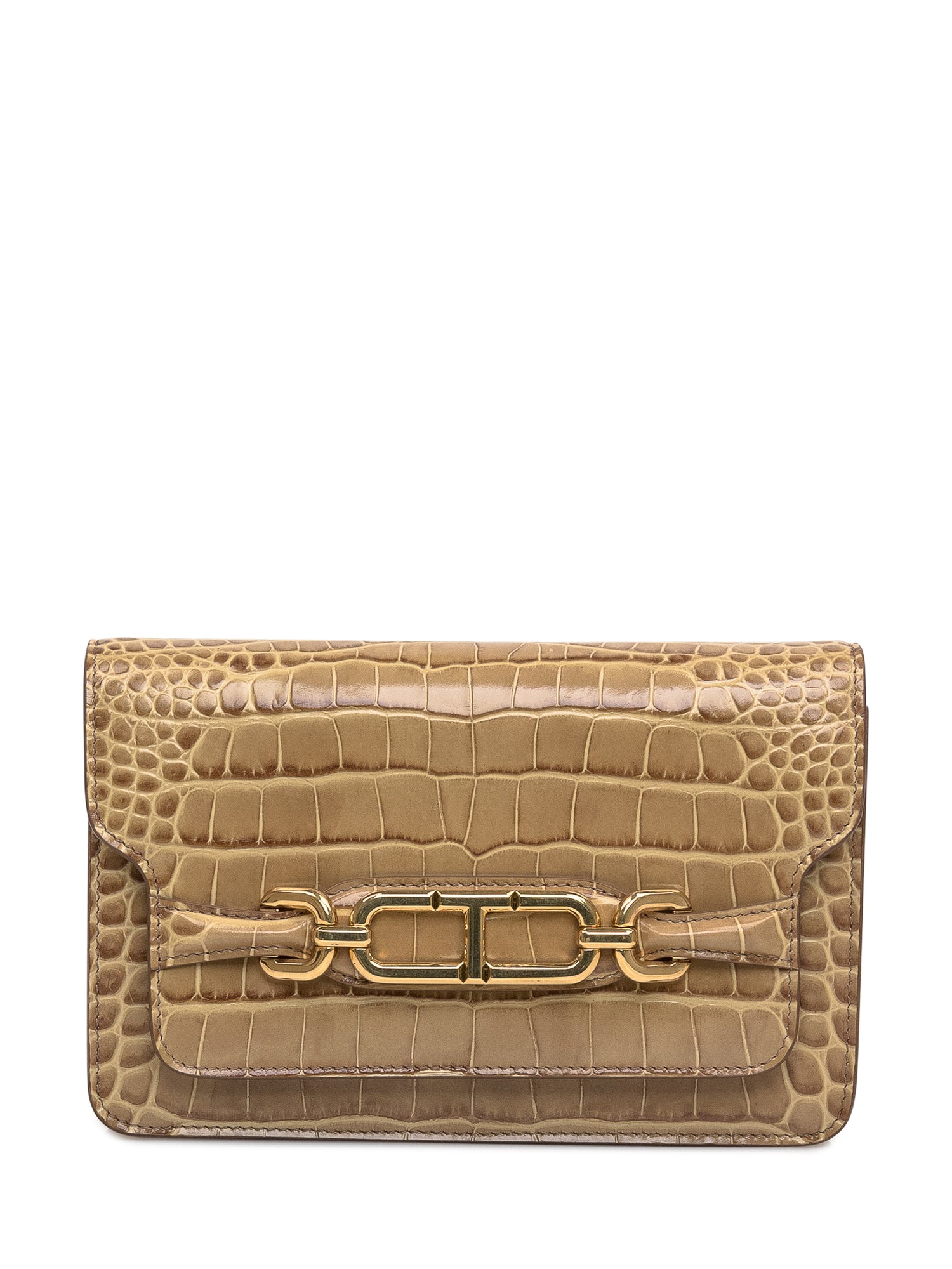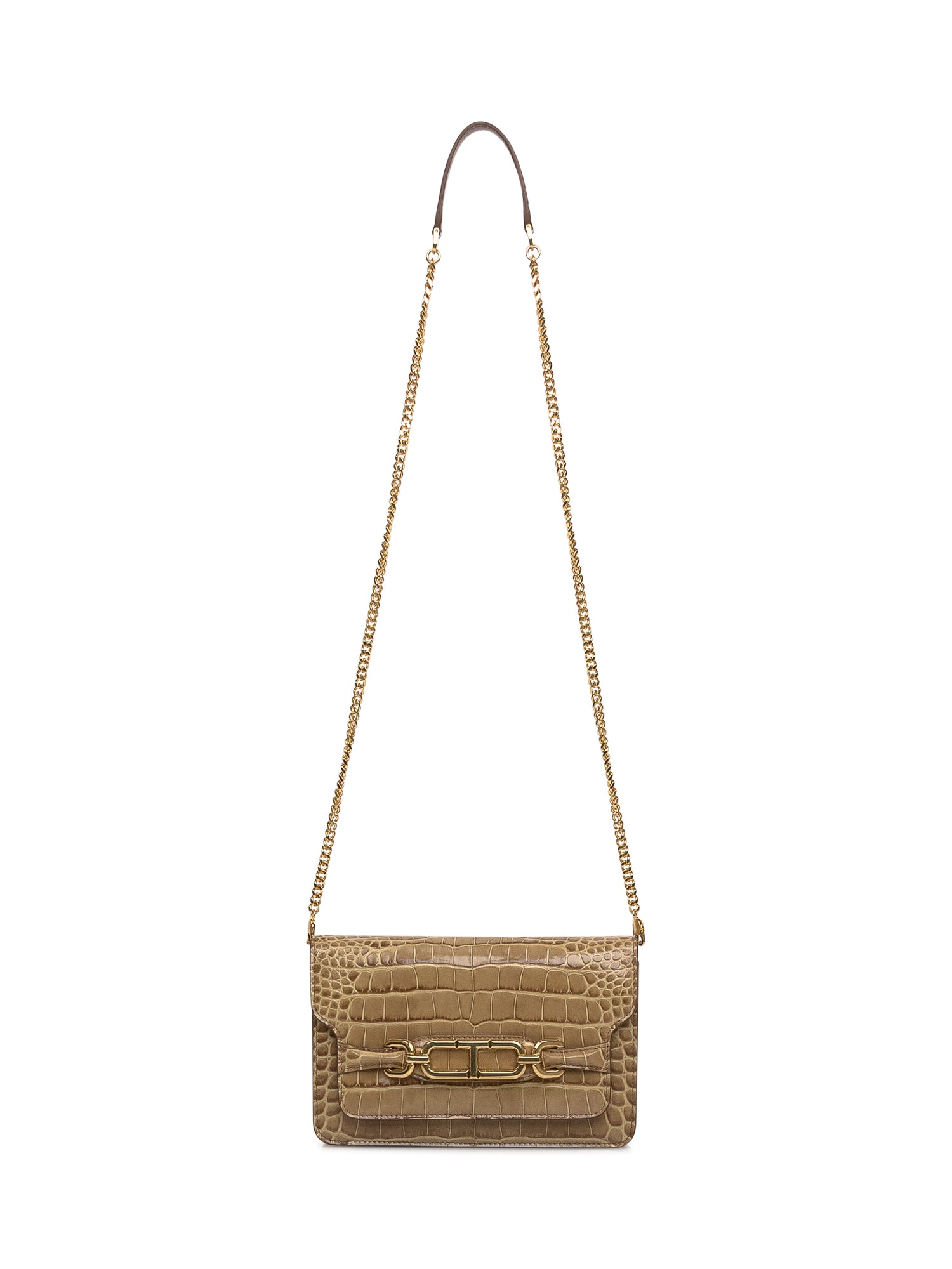 Shoulder bag in printed crocodile leather. Front lever decorated with metal signature T-shaped. Removable and adjustable chain strap. Magnetic closure. A compartment with an open inner pocket.