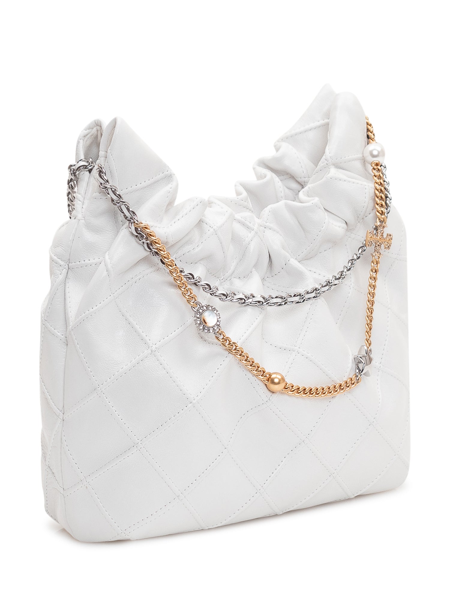 Soft shoulder bag with quilted texture and gathered top closure.Size: 9.45x8.66x2.76