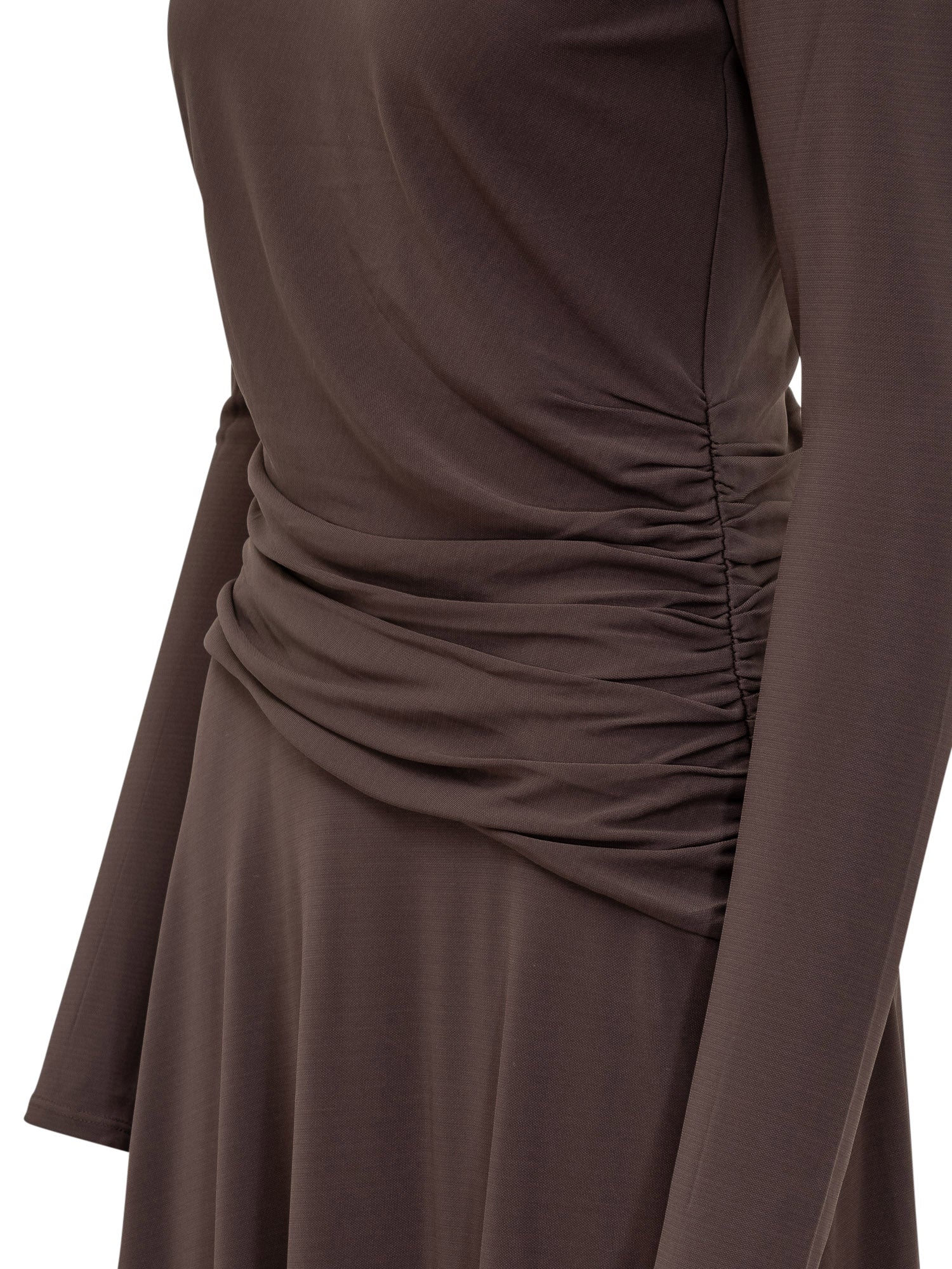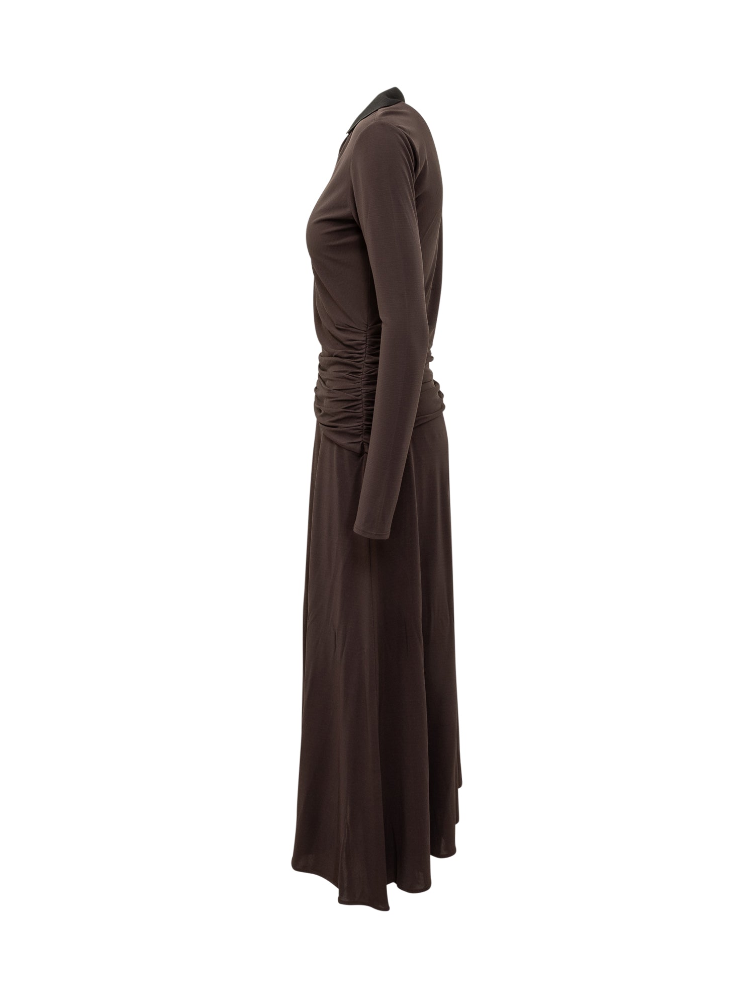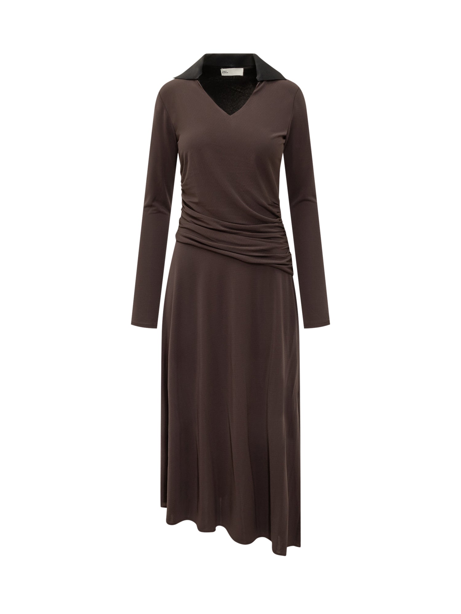 Tory Burch midi dress in brown with black contrast collar and ruched waist detail.