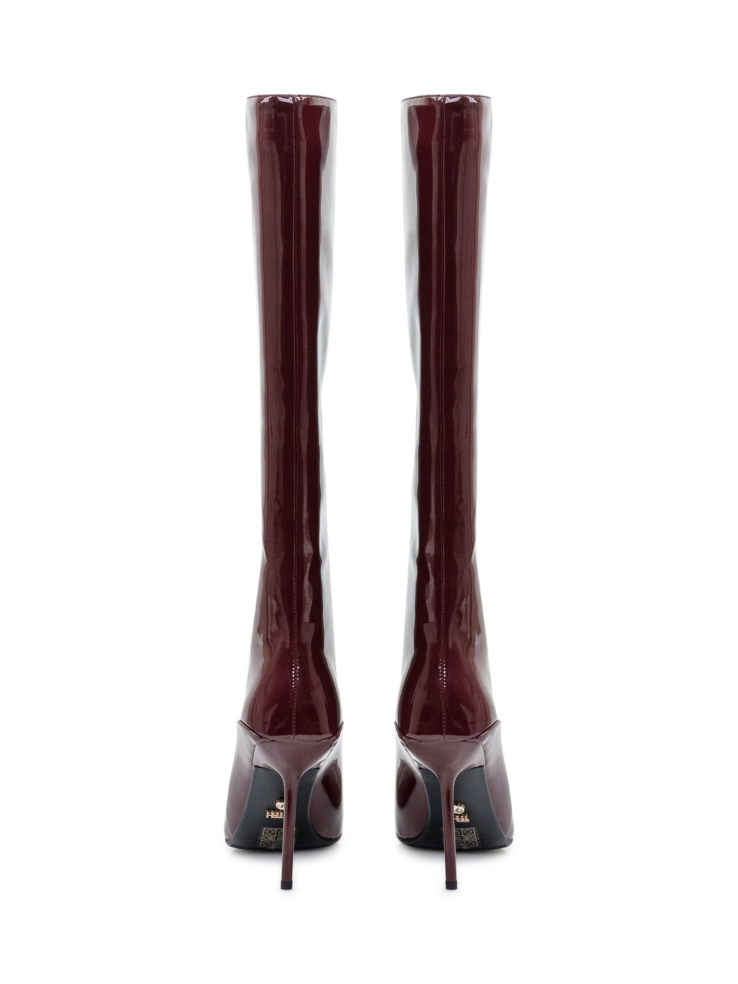 Twenty Four Haitch boots in bordeaux patent leather with pointed toe and stiletto heel. Elegant and bold, they add a sophisticated and alluring touch to evening or special occasion outfits.