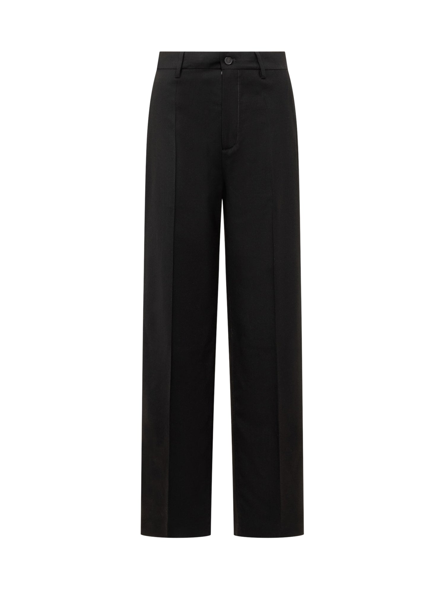 Black long trousers. Button and zip fastening. Wide leg. Belt loops.
