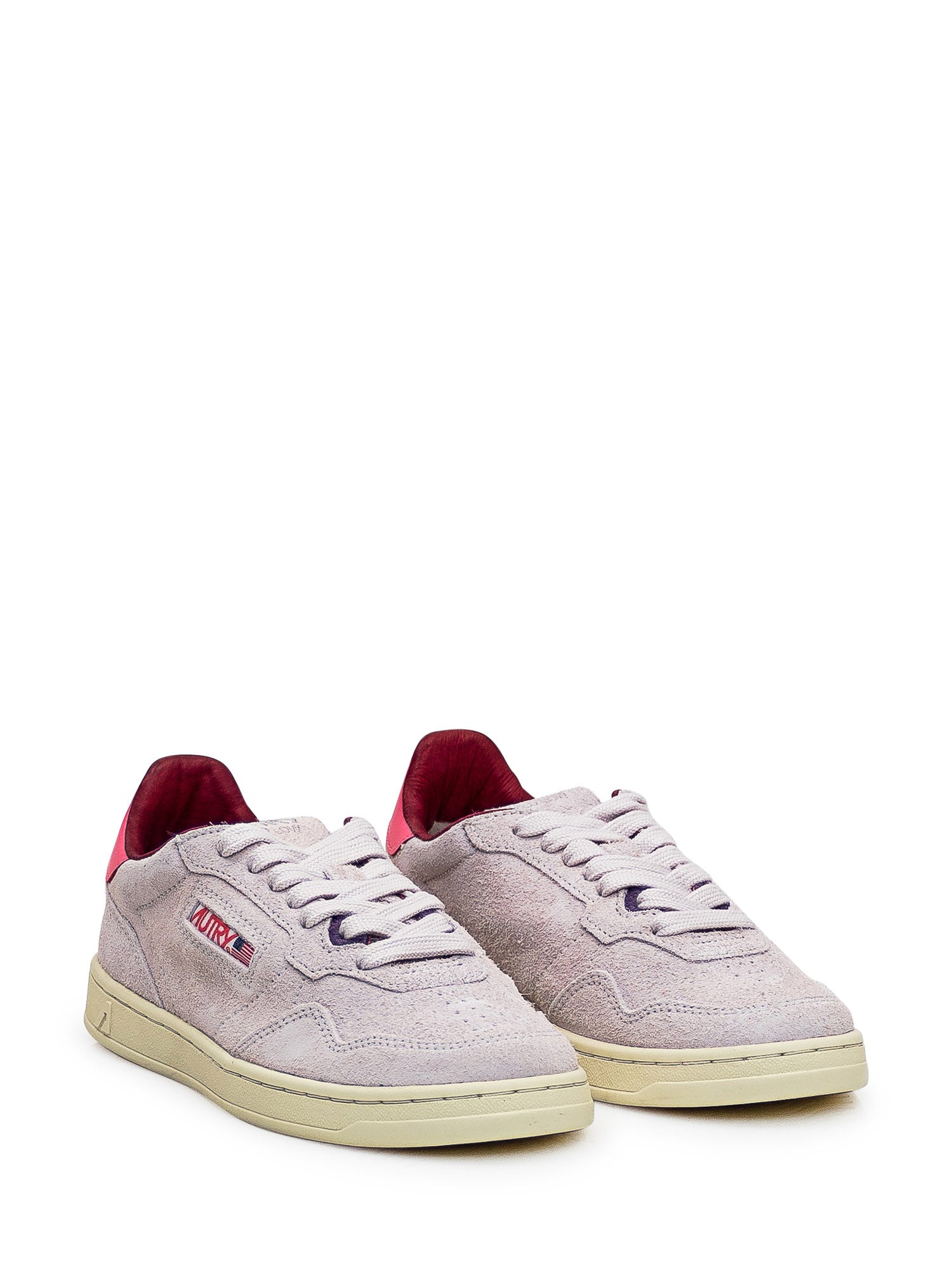 Gray suede sneaker. Lace-up closure on the front. Logo on the tongue. Contrasting leather heel with logo. Logo on side.