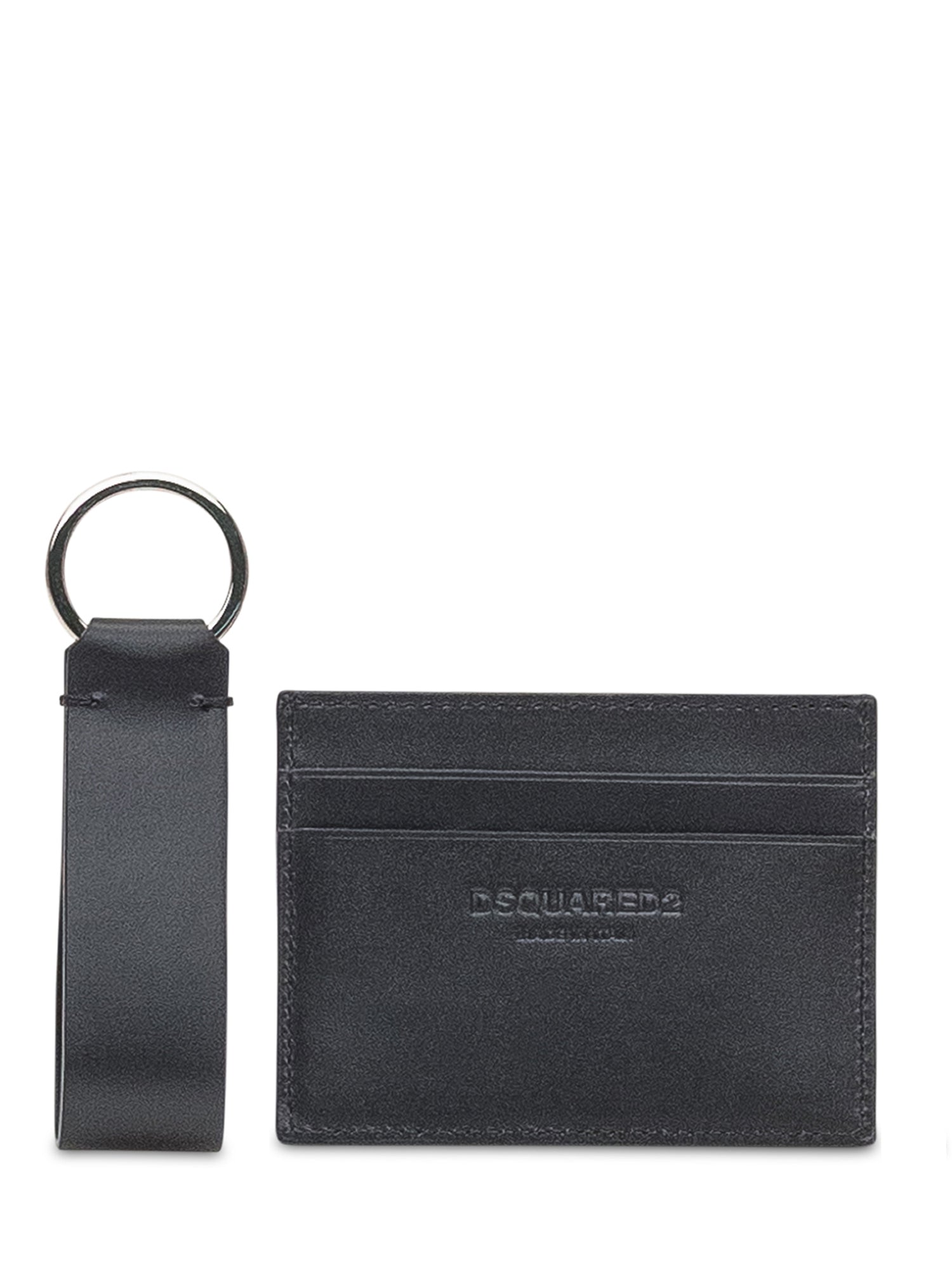 Black leather Dsquared2 card holder with white logo print and matching key ring. Compact and functional design.