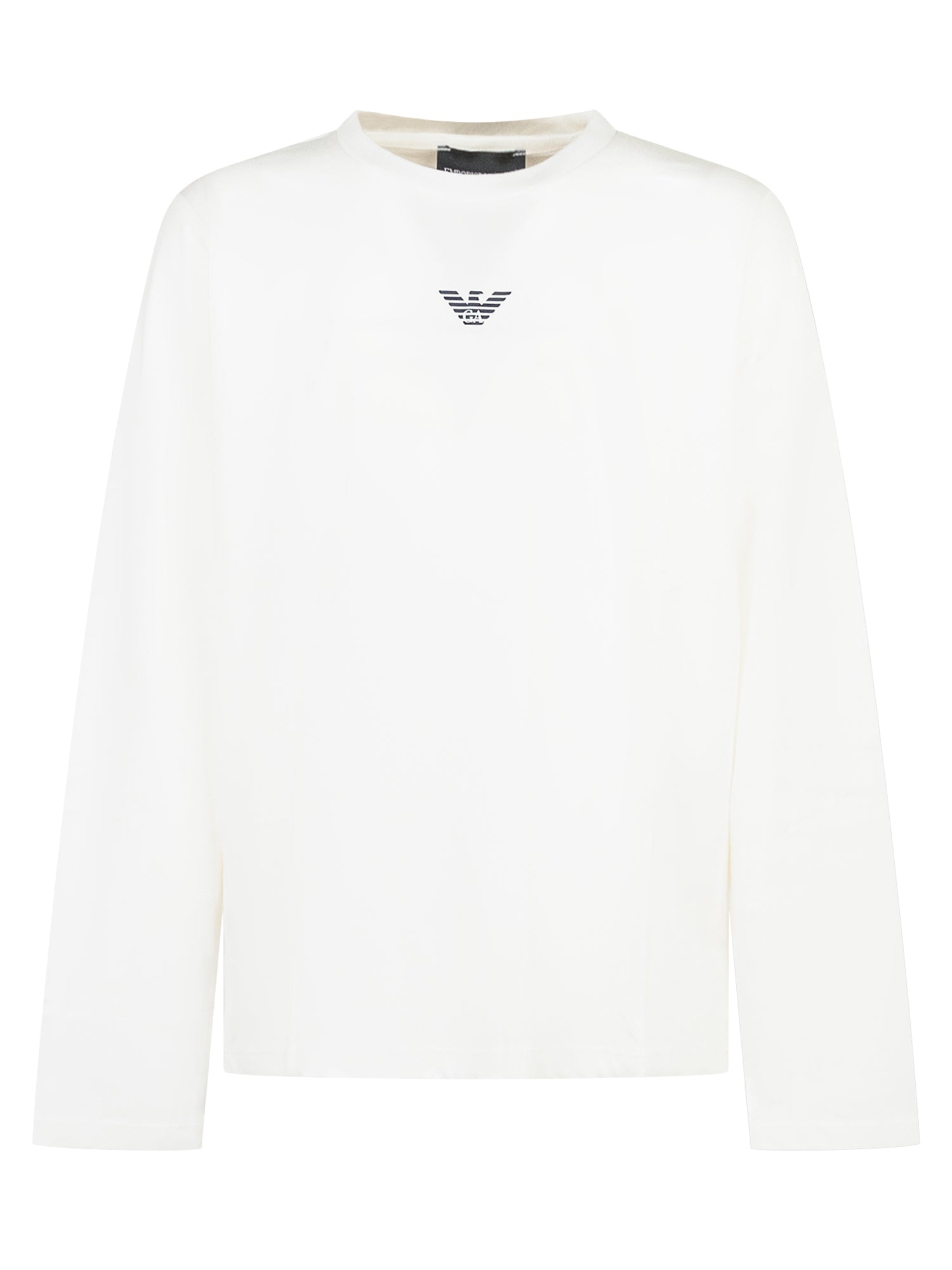 Emporio Armani boys white cotton long-sleeve shirt with embroidered Eagle logo on the chest.