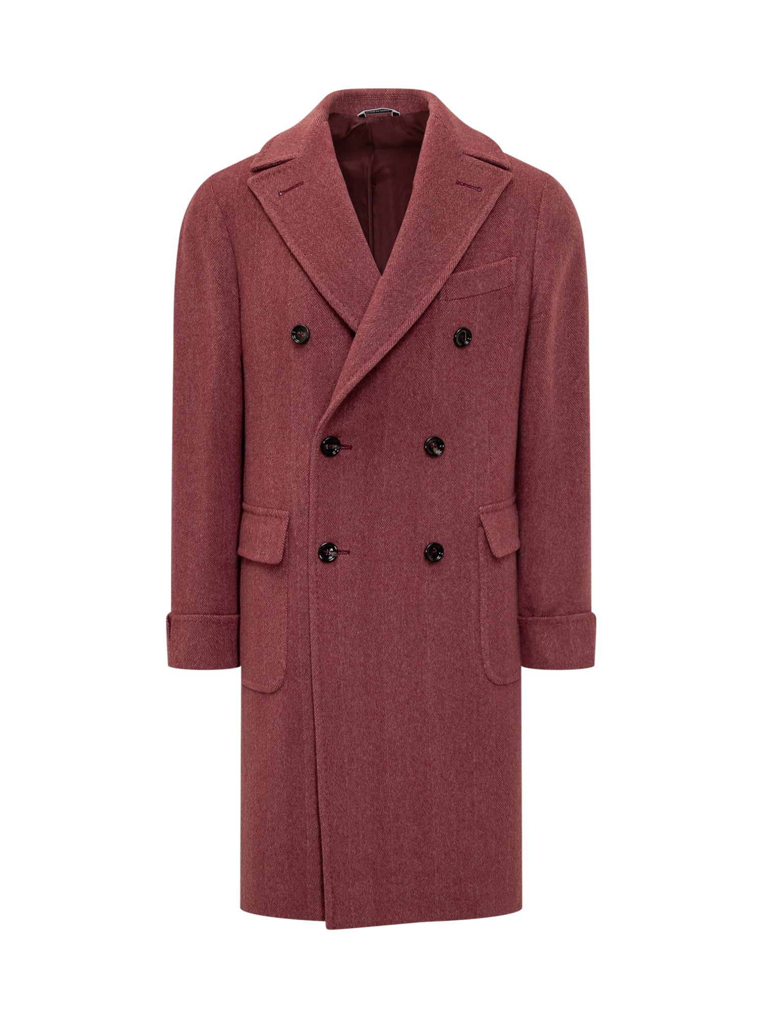 Esterno double-breasted coat in bordeaux red wool with classic lapels and front pockets.