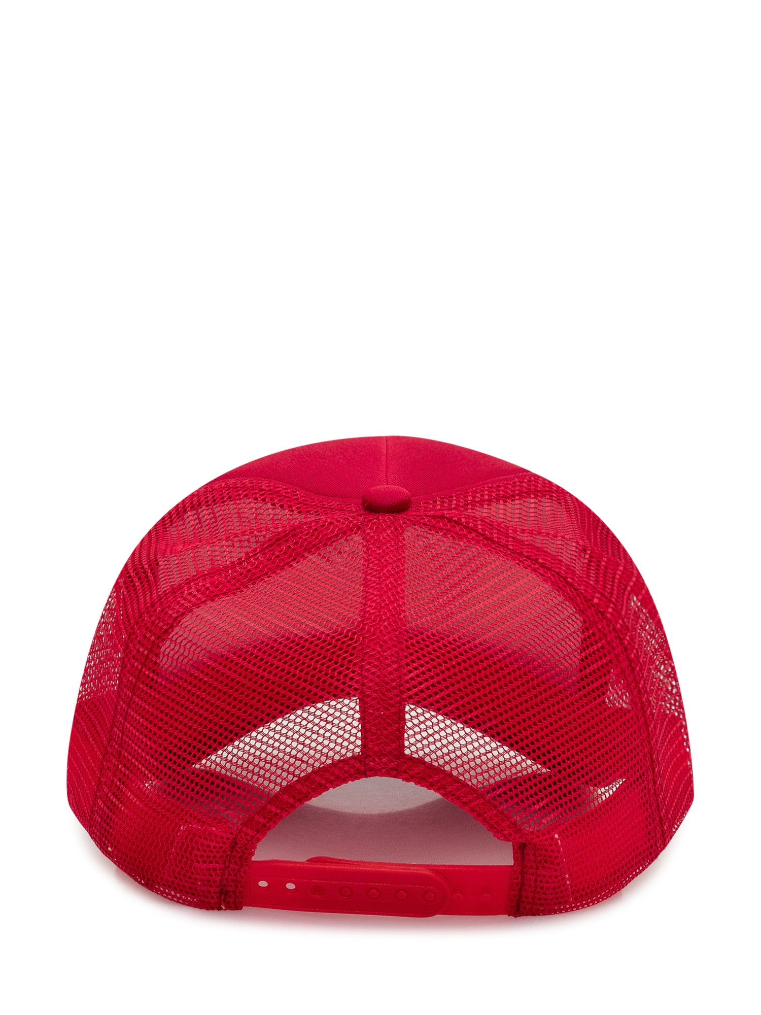 Trucker cap with structured front panel and curved visor. Contrasting printed logo on the front and mesh back. Design with visible stitching and sporty shape, ideal to complete contemporary outfits.