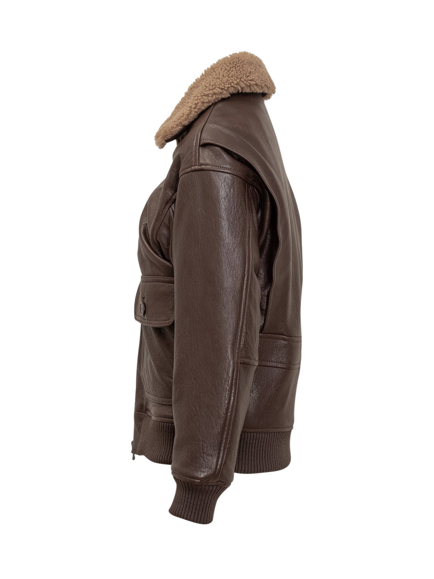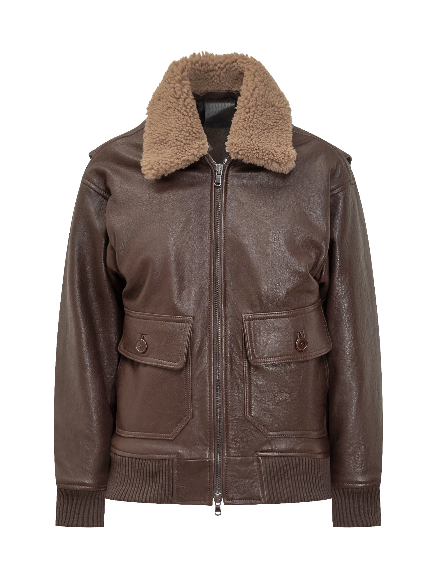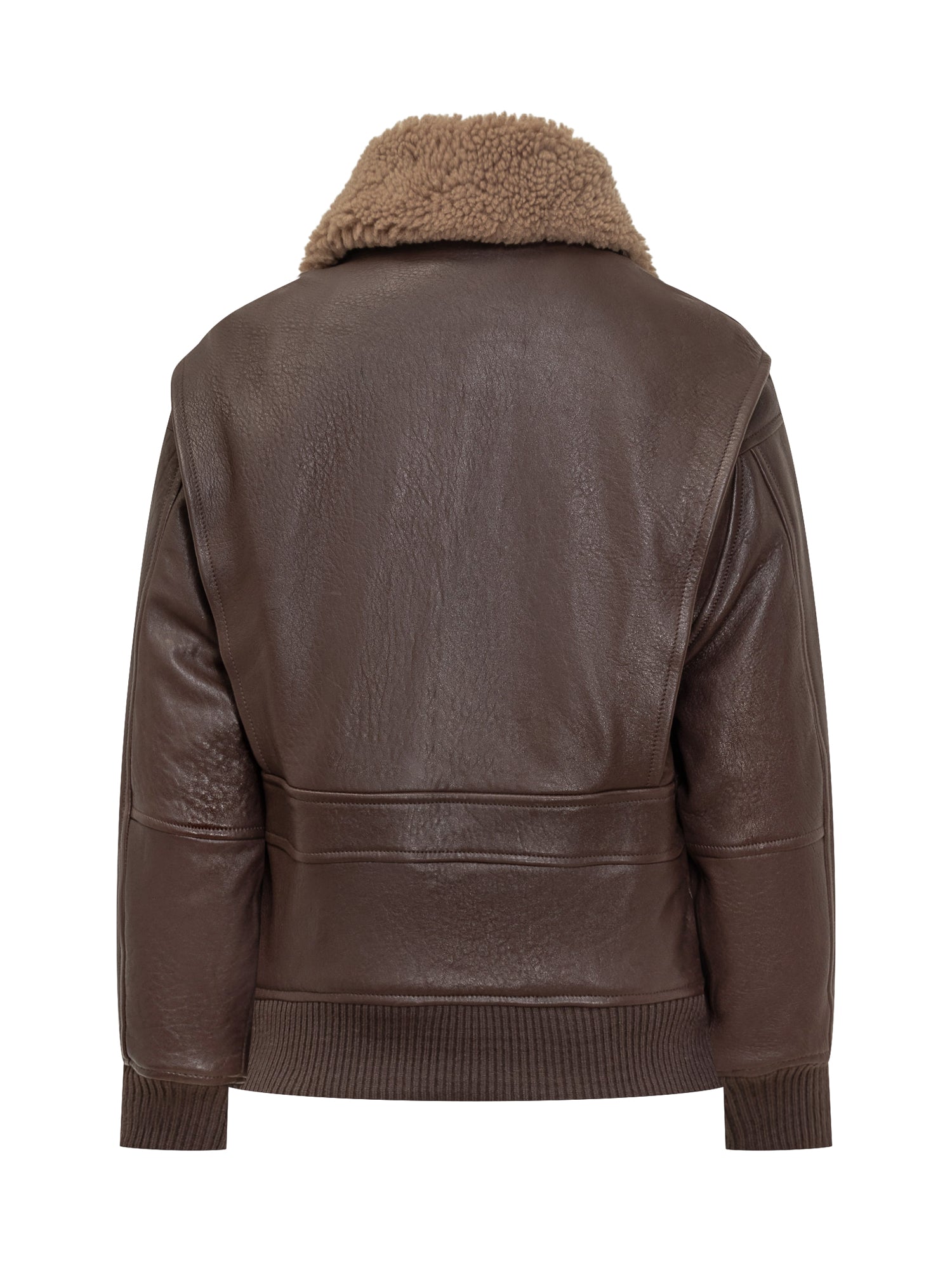 Giocasta brown leather jacket with shearling collar, patch pockets and front zip.