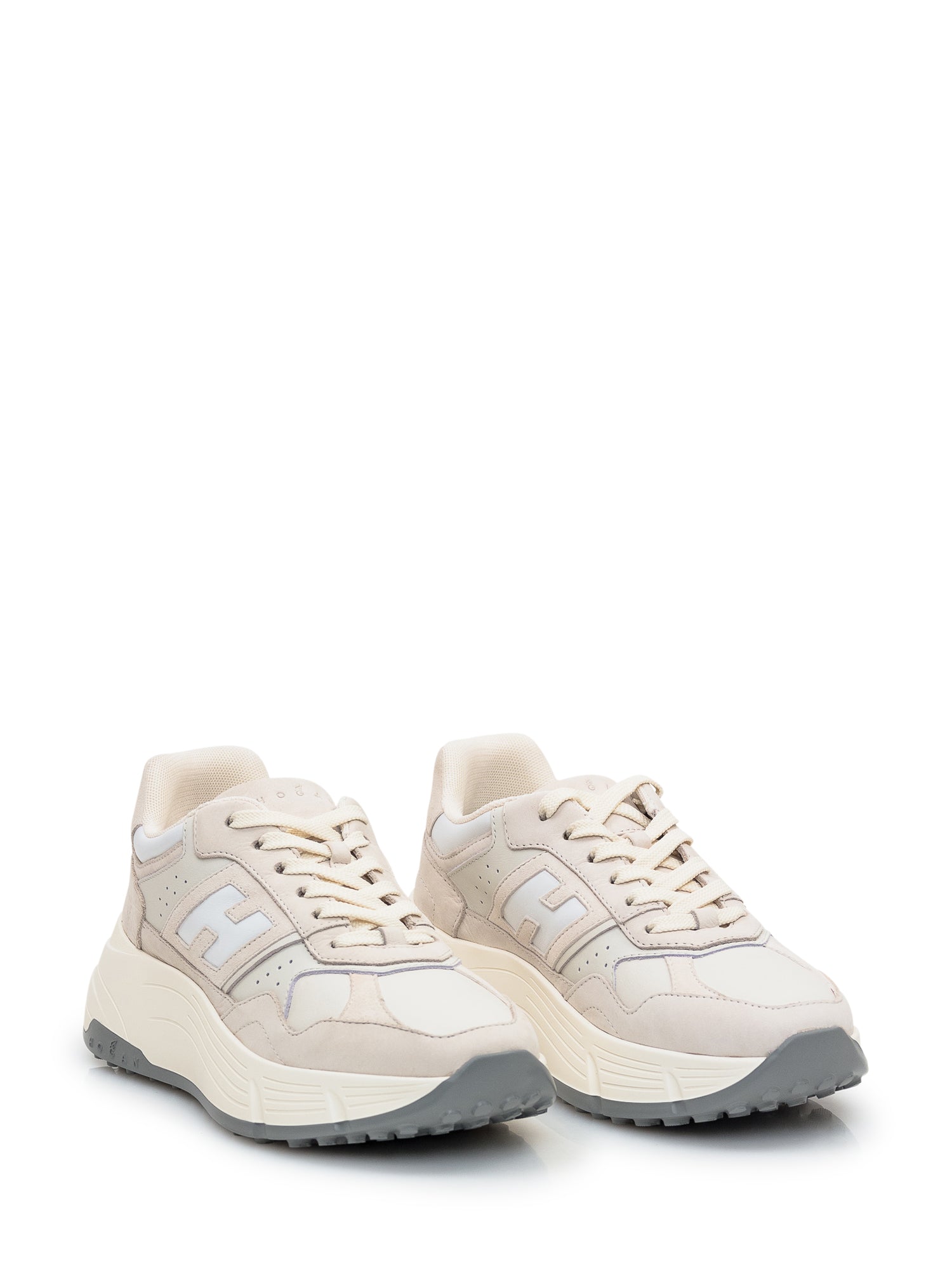 White sneakers. Lace-up front. Round toe. Suede leather details. Monogram H on the side. Perforated details.