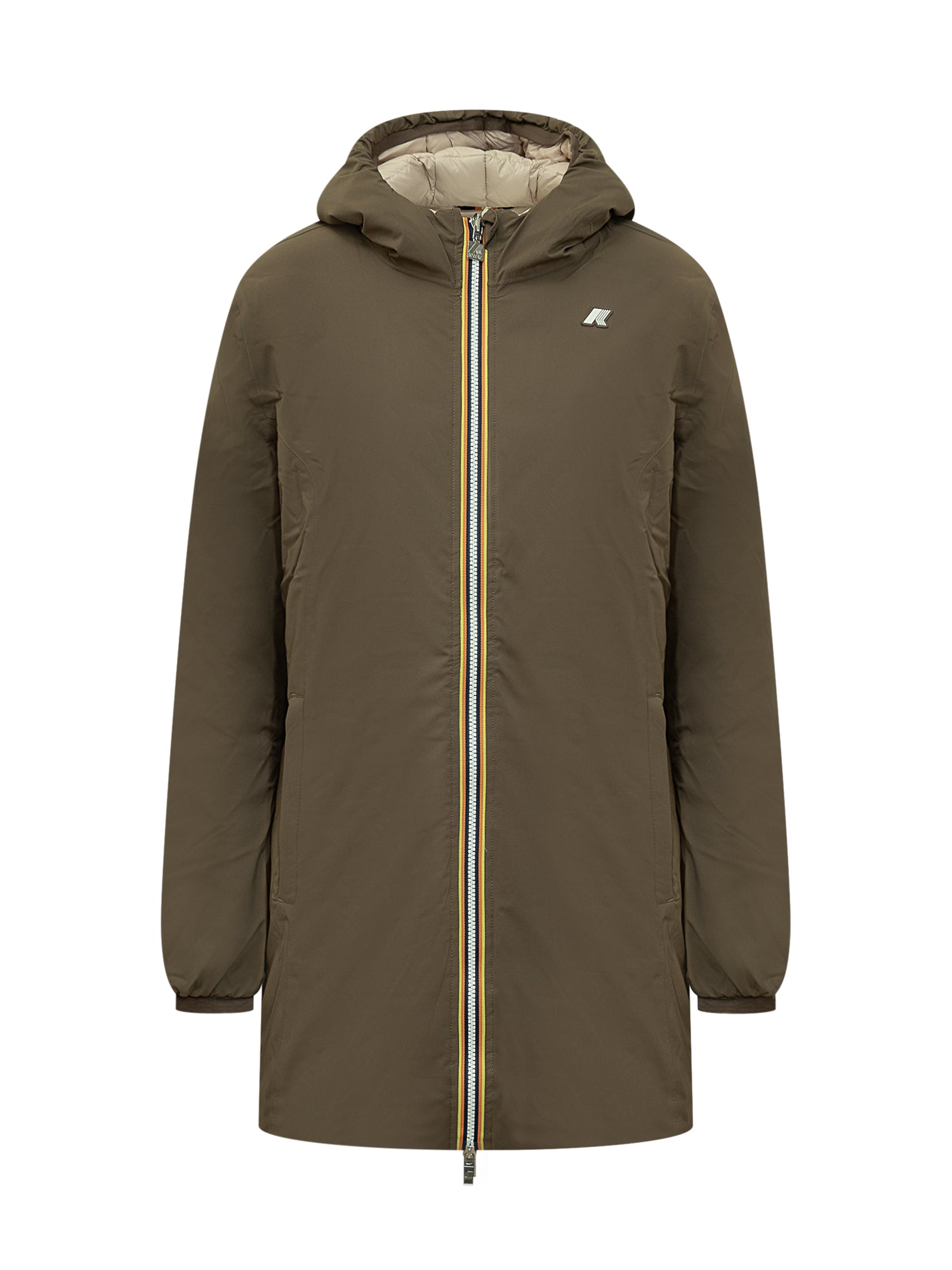 Long brown down jacket with hood. Logo applied on the front. Zip pockets. Closure with zip.