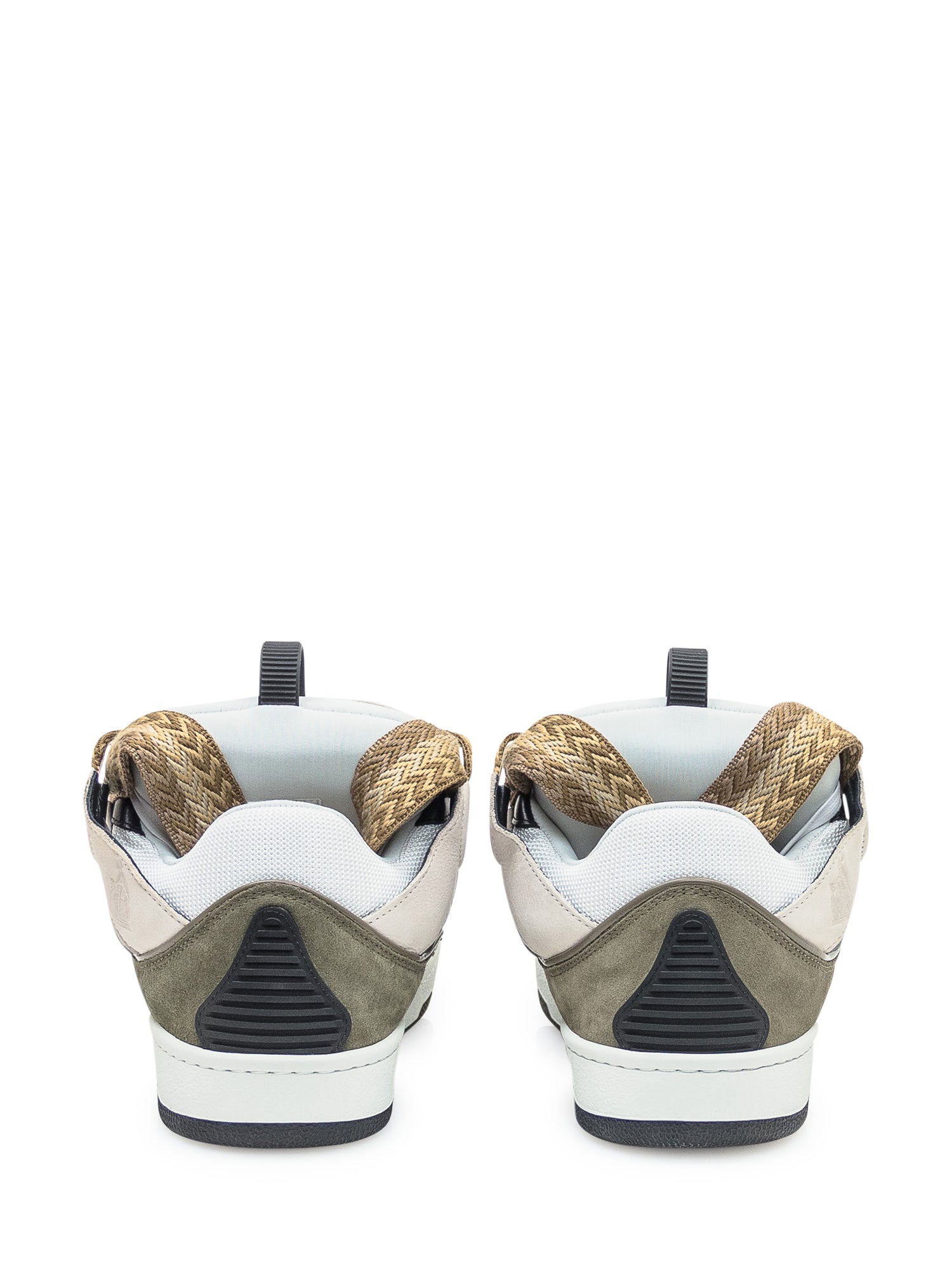 Low-top sneakers in beige leather and suede with cut-out details and oversized woven laces.