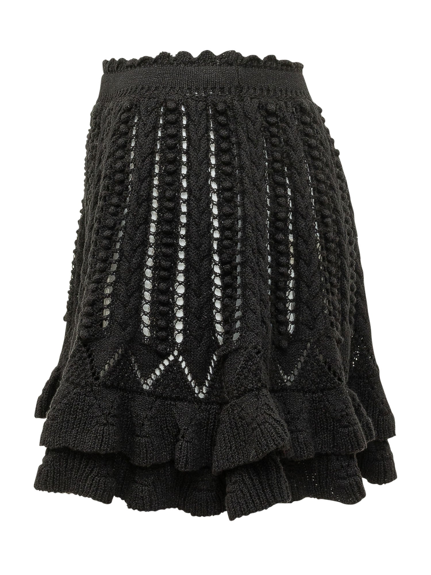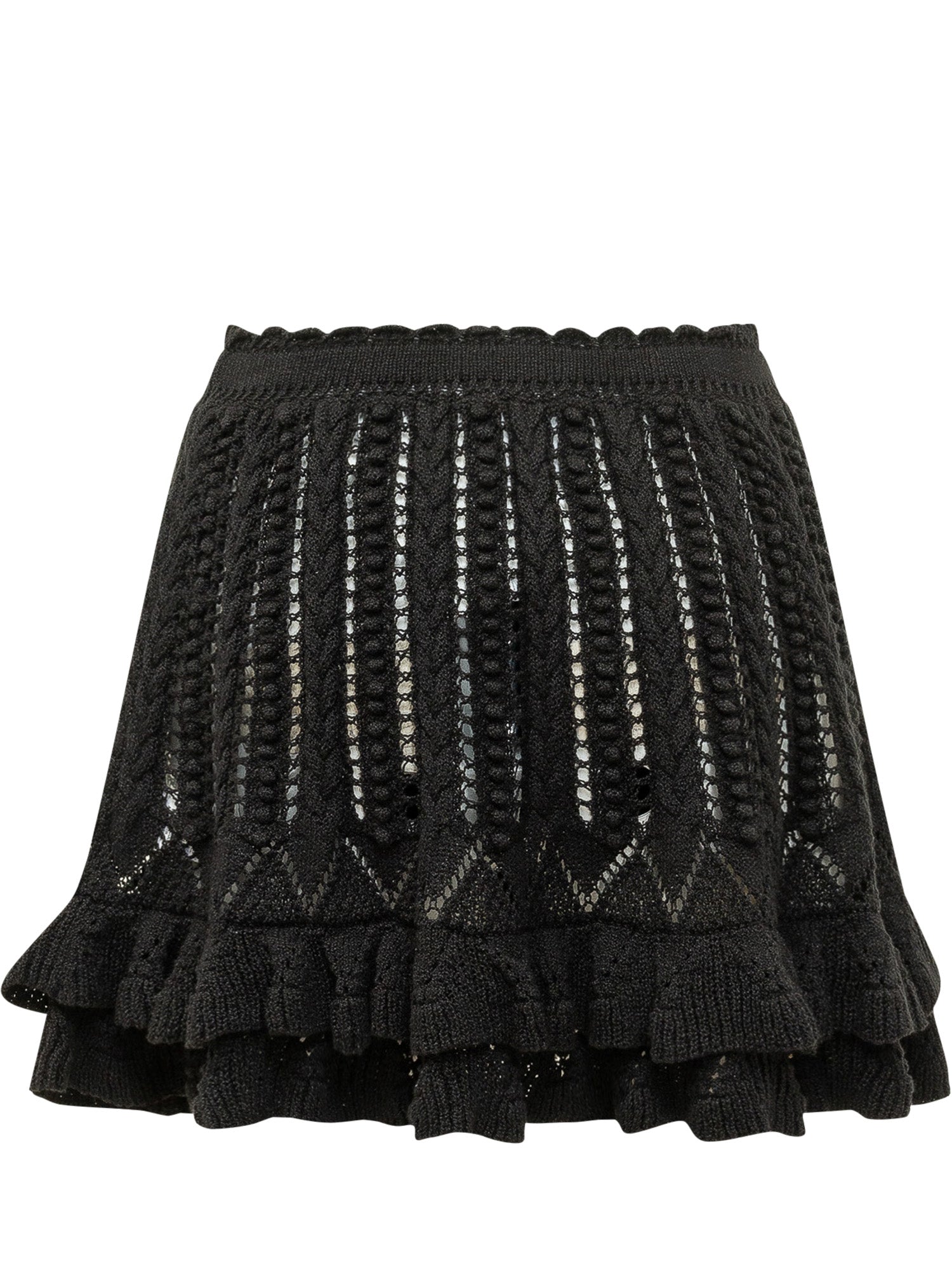 Short knitted skirt with vertical openwork pattern, elasticated waistband and ruffle hem, flared silhouette ideal for feminine looks and refined styling.