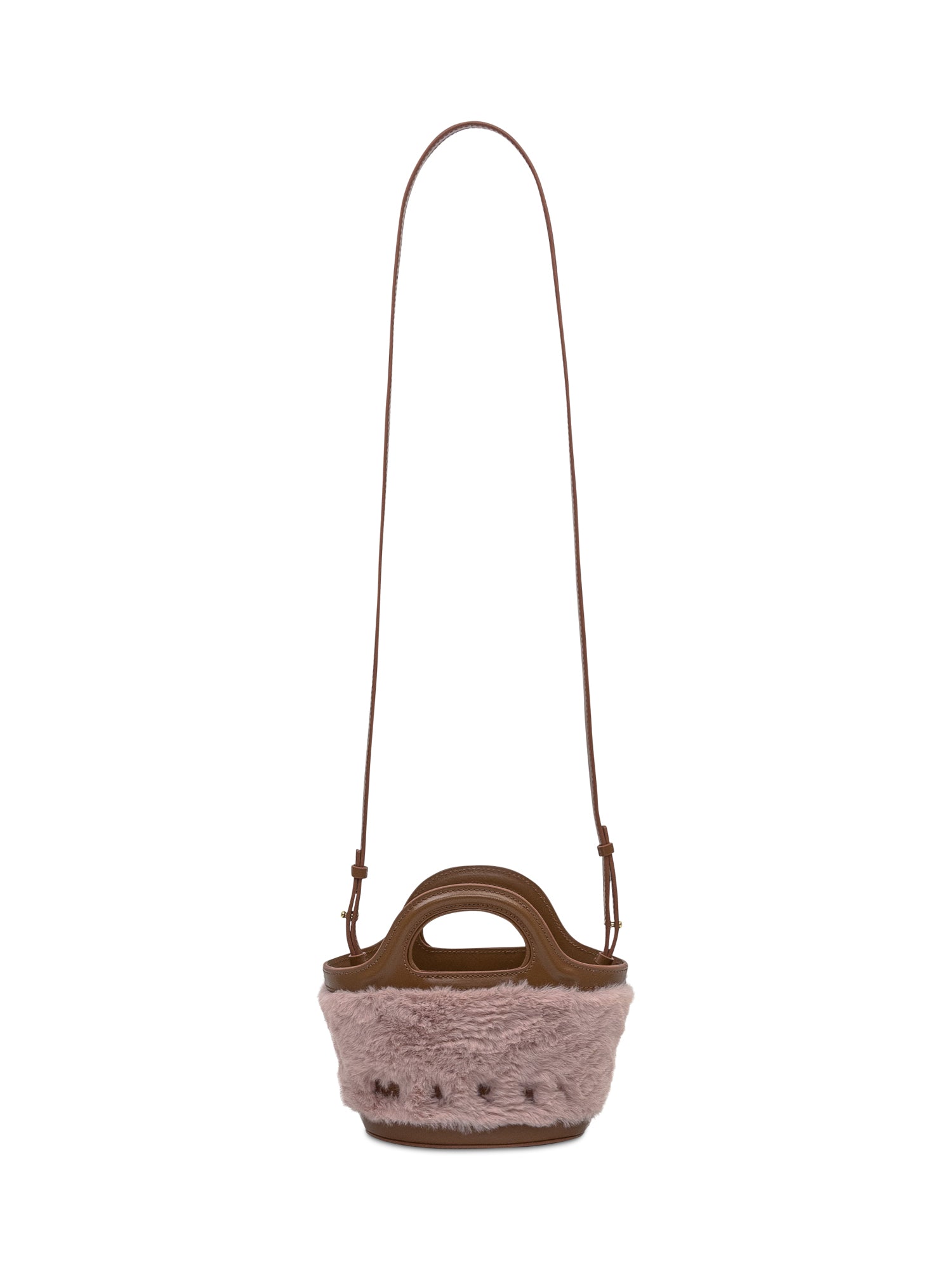 Brown leather tote with pink fur inserts and embroidered logo.