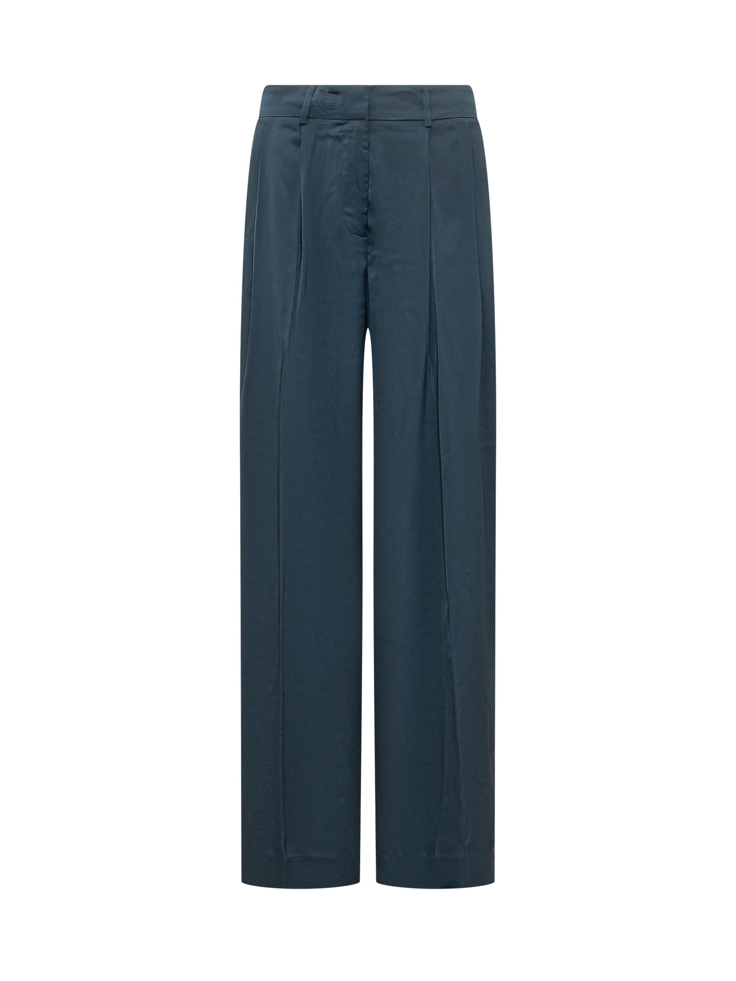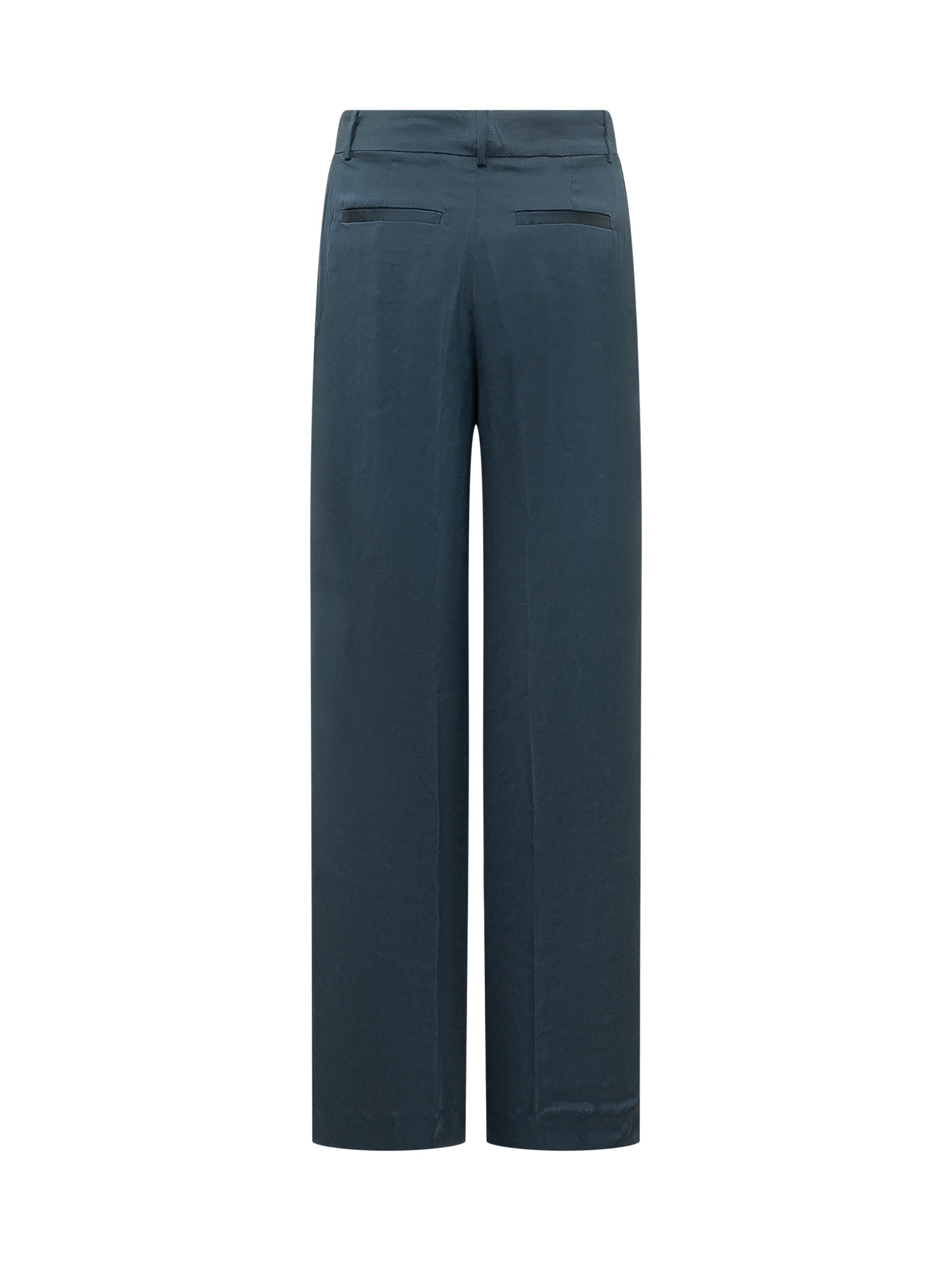 Satin wide leg pants, high waist with belt loops, pressed front crease, zip and hook closure.