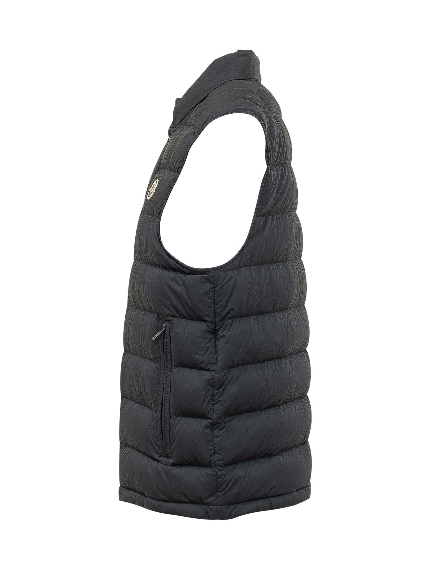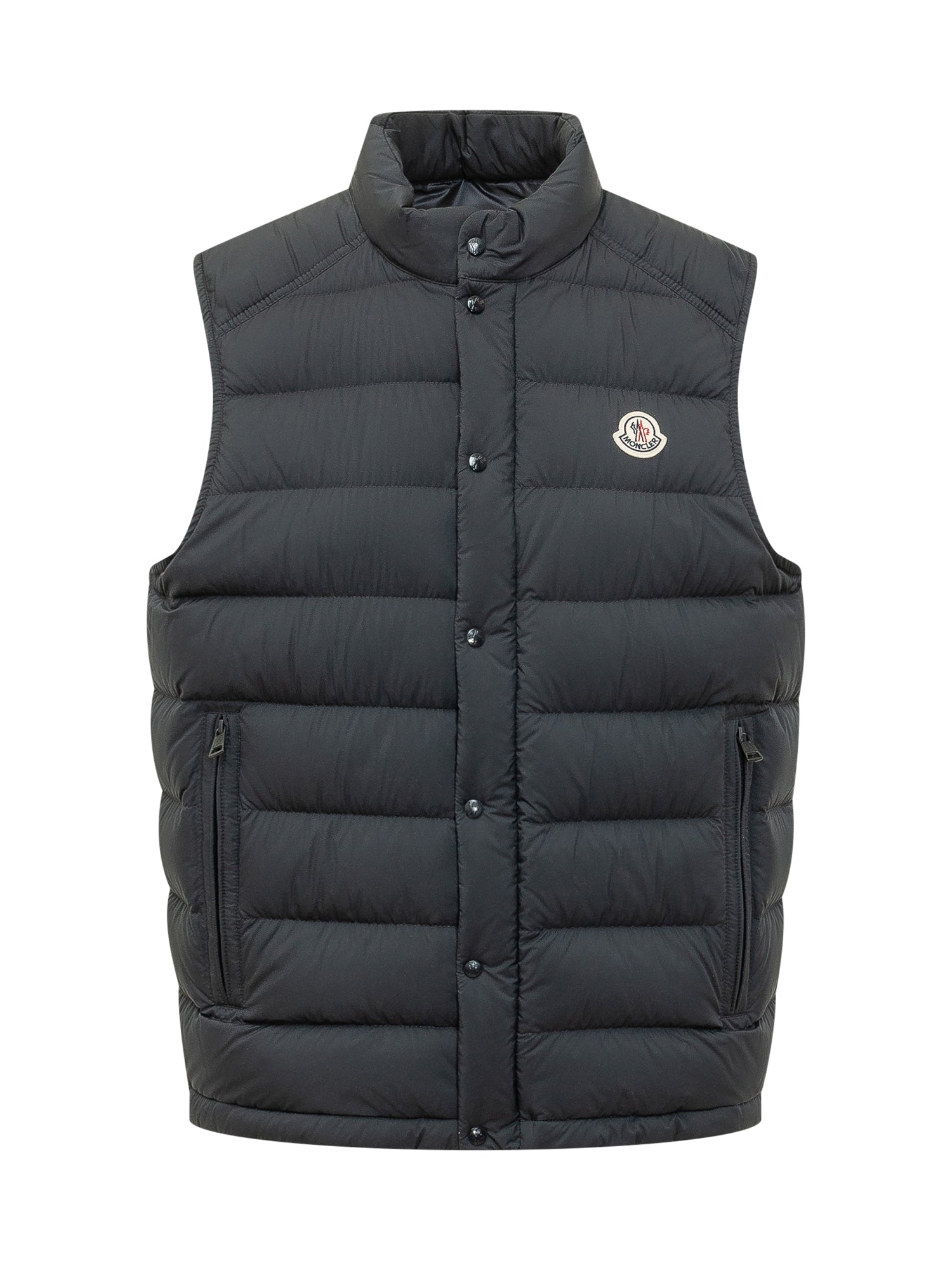 Barthe padded vest with a clean and versatile design, crafted from technical nylon with horizontal quilting. Featuring a high collar, front snap-button closure with concealed zip, and zipped side pockets.