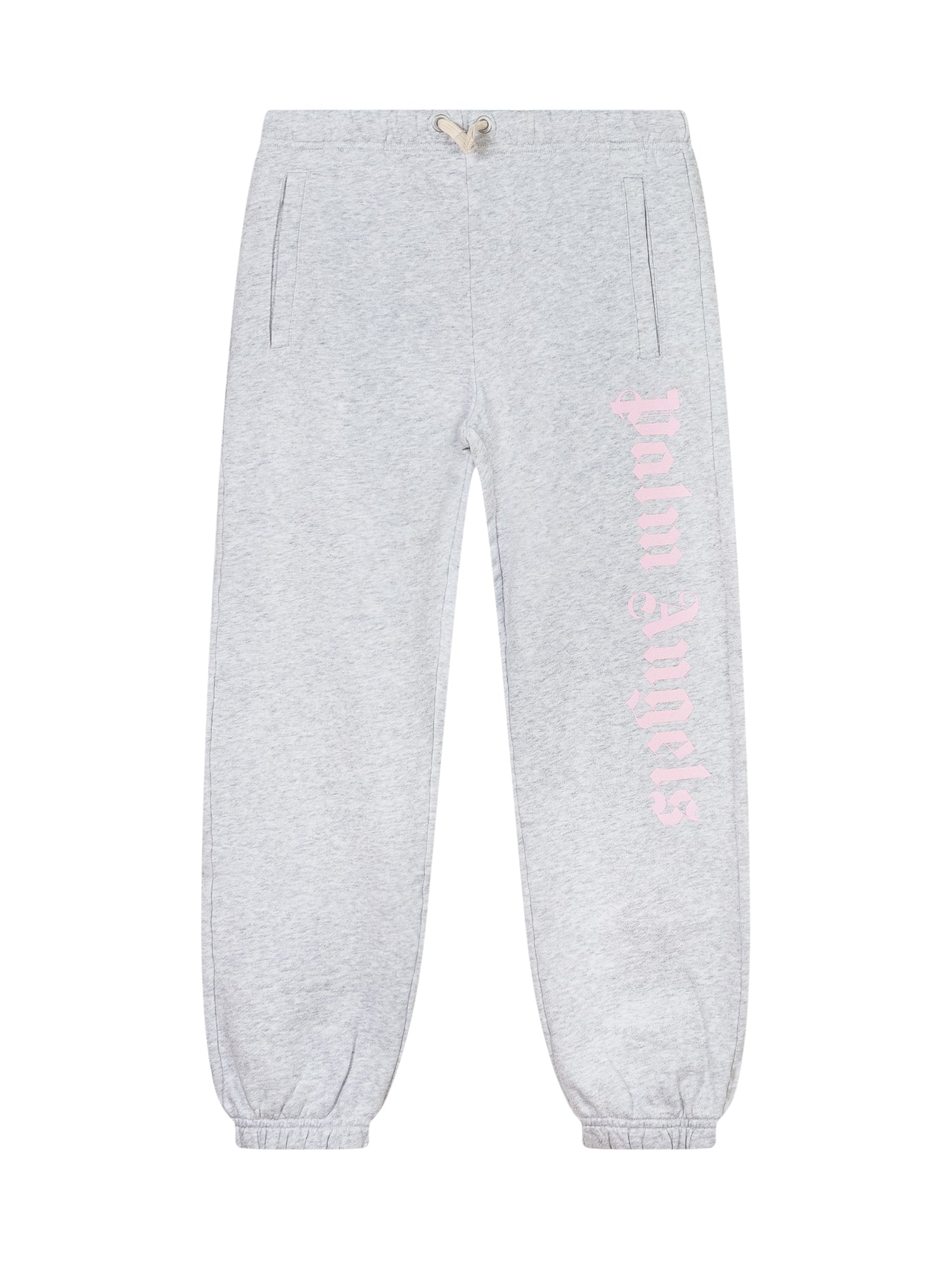 Palm Angels Kids grey cotton joggers with pink contrast logo, adjustable waist and elasticated cuffs.