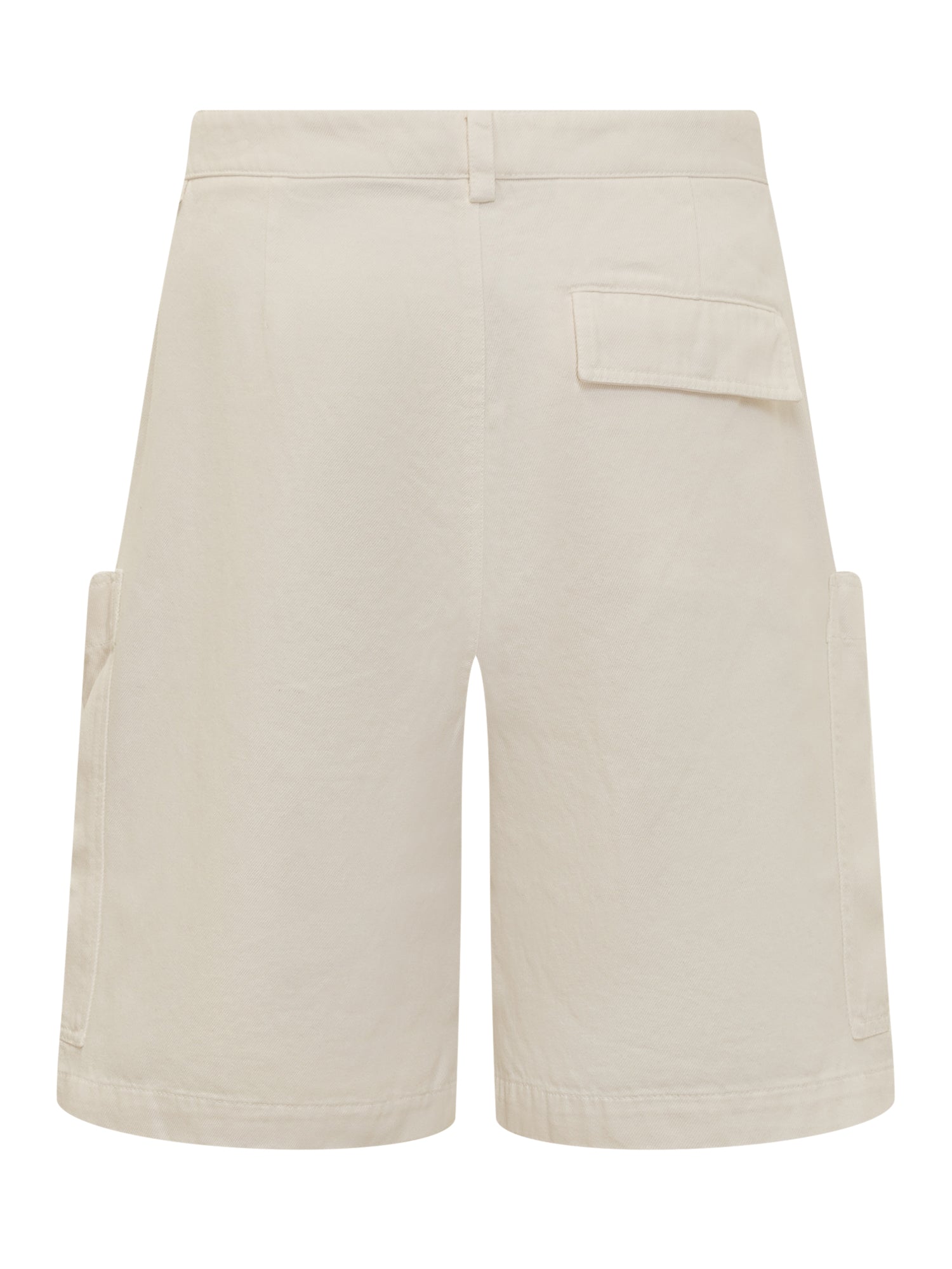 Cargo shorts. Belt loops. Zipper and button closure. Two slanted front pockets. Two cargo pockets with logoed button. One flap pocket on the back.