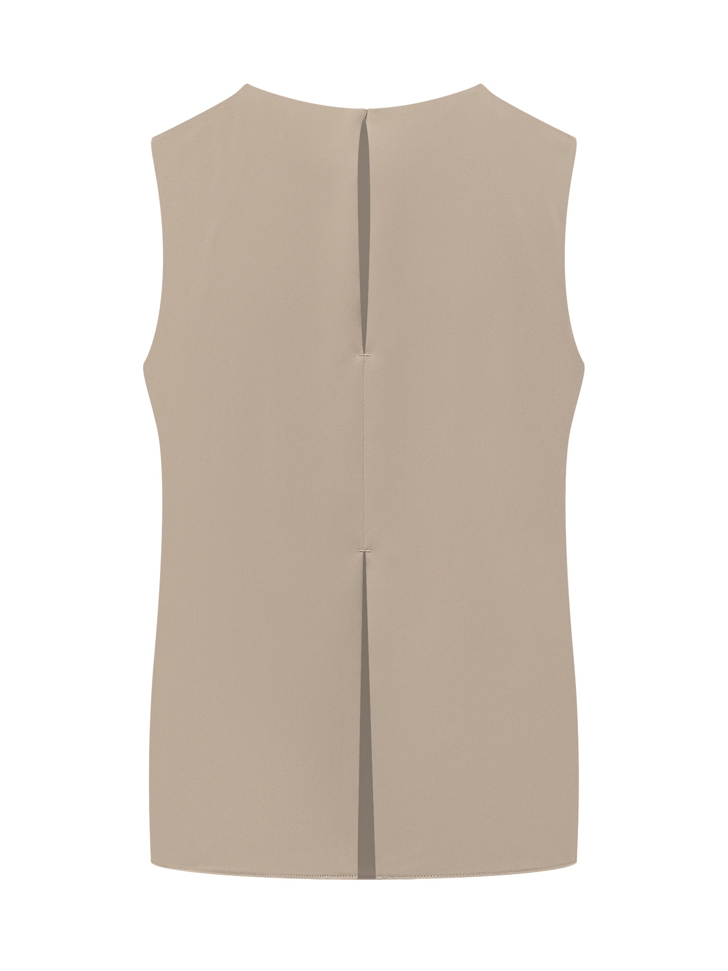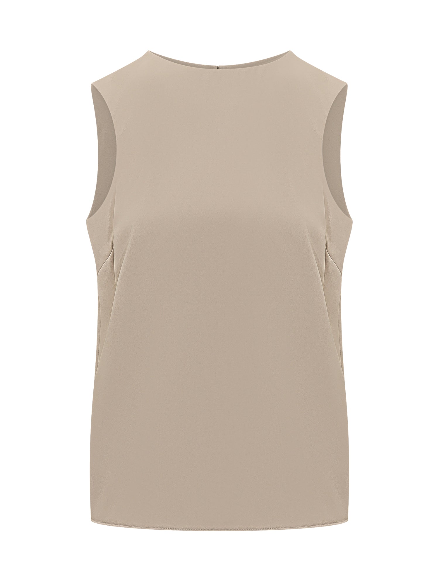 Womens sleeveless blouse, boat neckline, clean straight silhouette, soft lightweight fit, discreet back closure