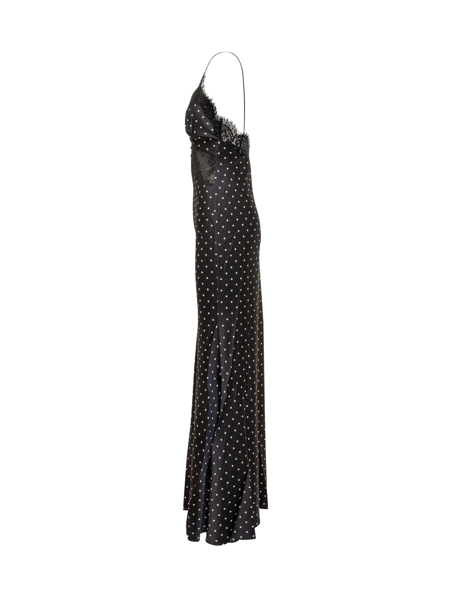Polka dot maxi dress with thin straps and lace detailing on the bodice for a touch of allure. Its fluid silhouette enhances the figure.
