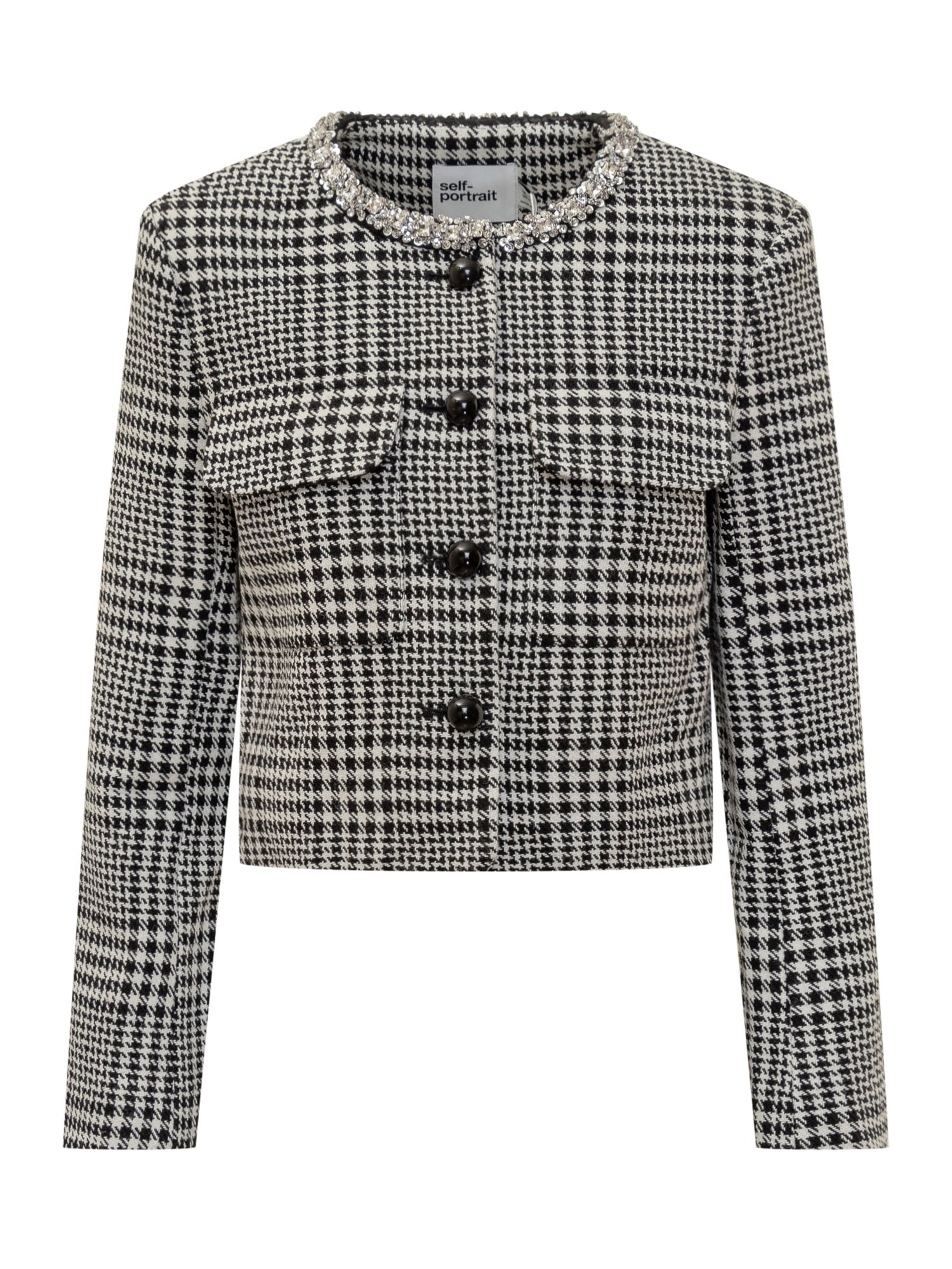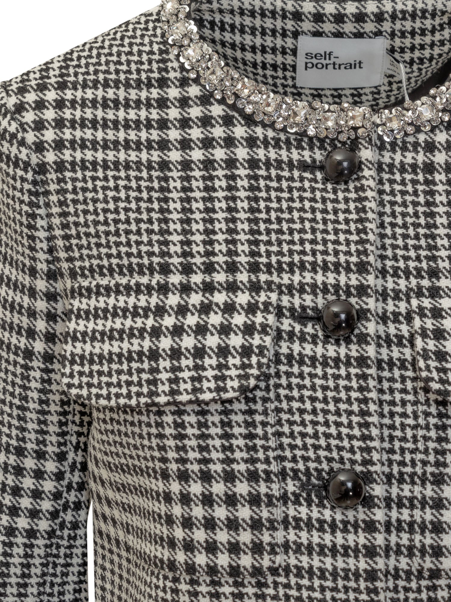 Short Self-Portrait jacket in black and white houndstooth fabric, embellished with a crystal-trimmed neckline. Jewel buttons and front flap pockets.