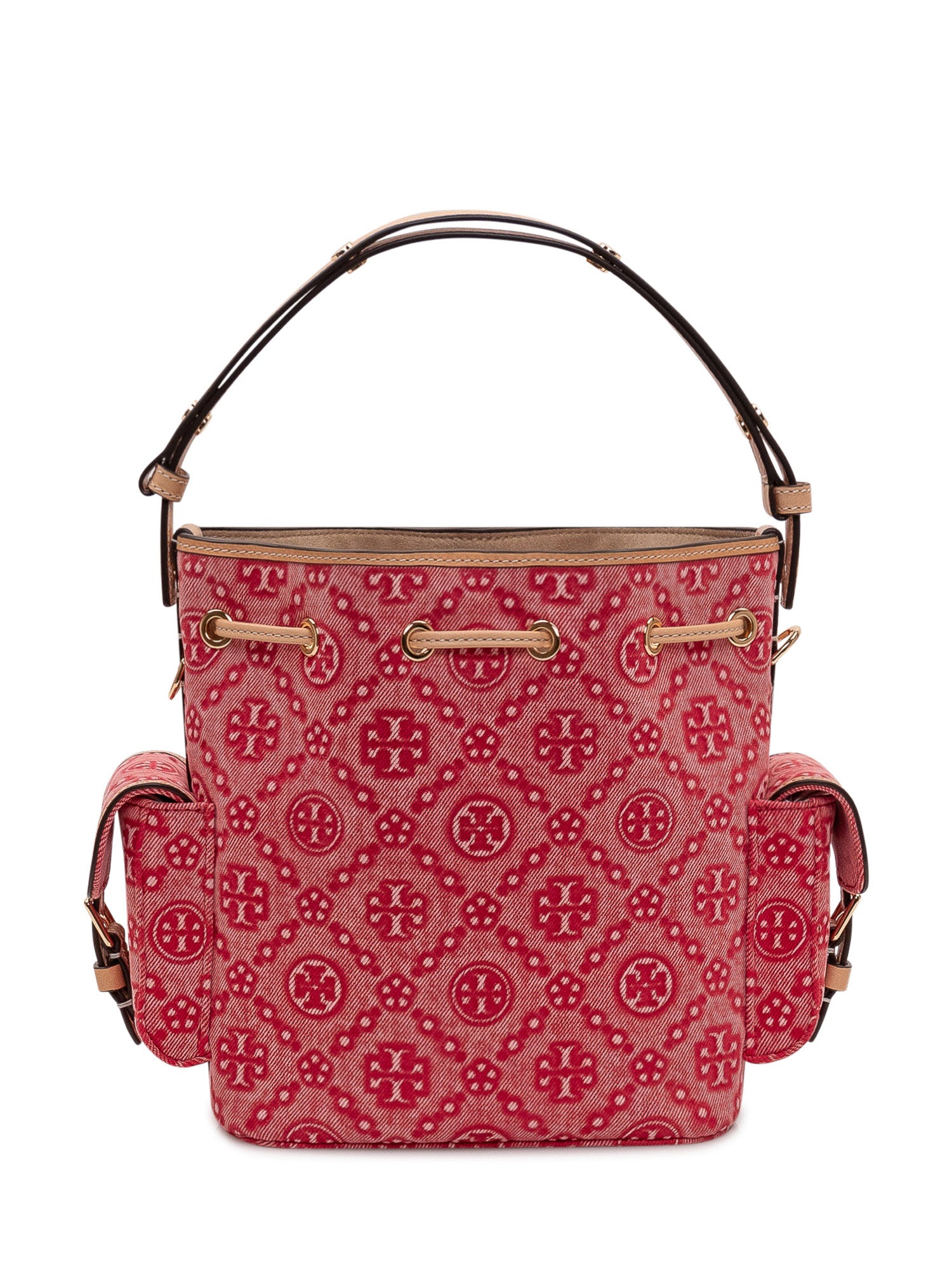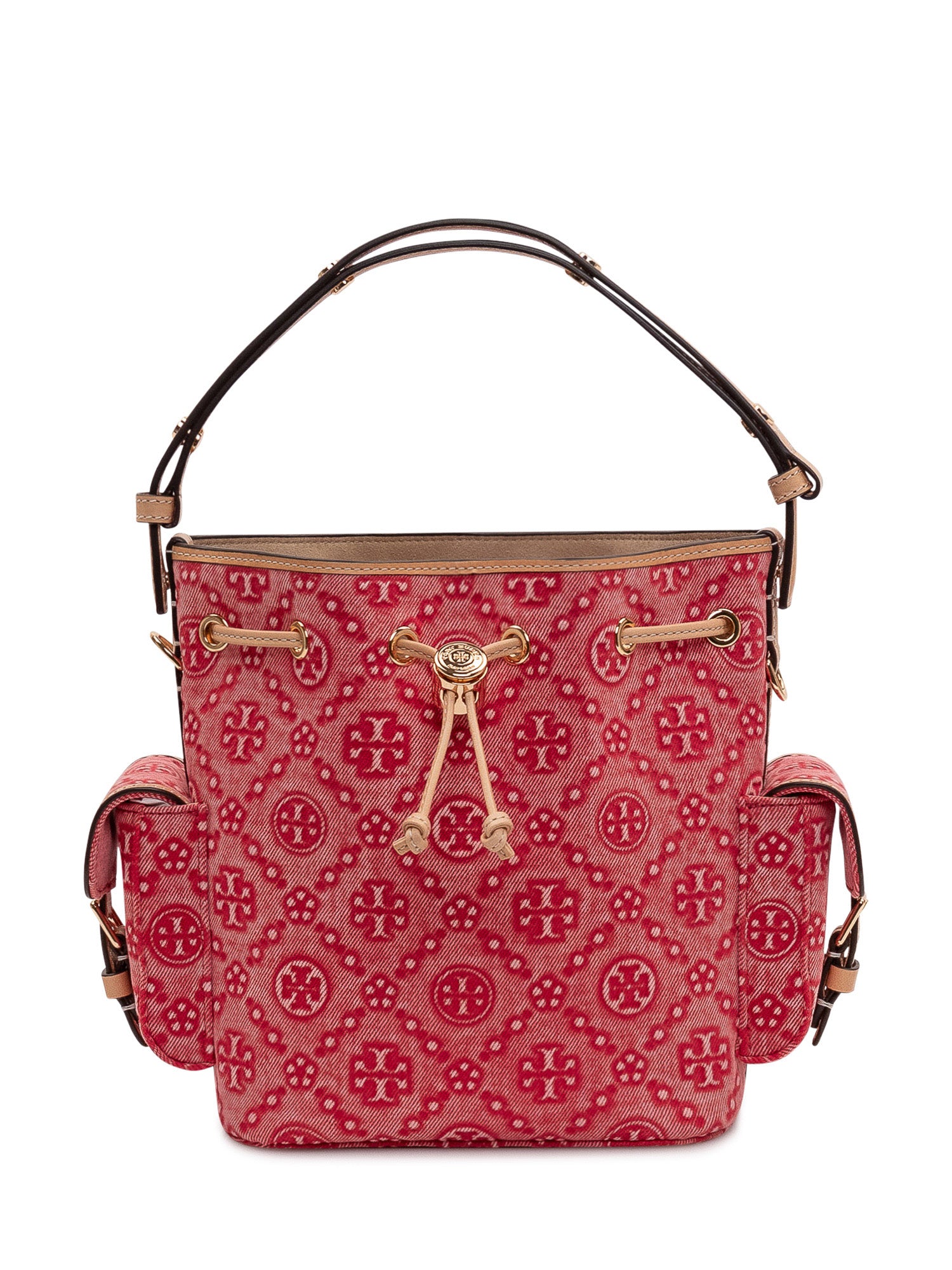 Shoulder bag with all over monogram pattern and soft structure. Drawstring closure and adjustable top handle. Side patch pockets and compact design ideal for everyday use.