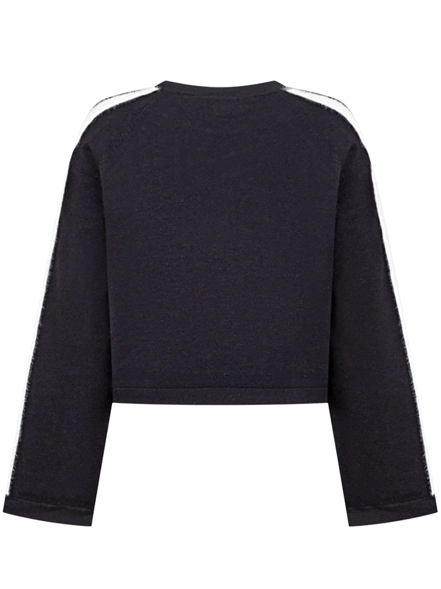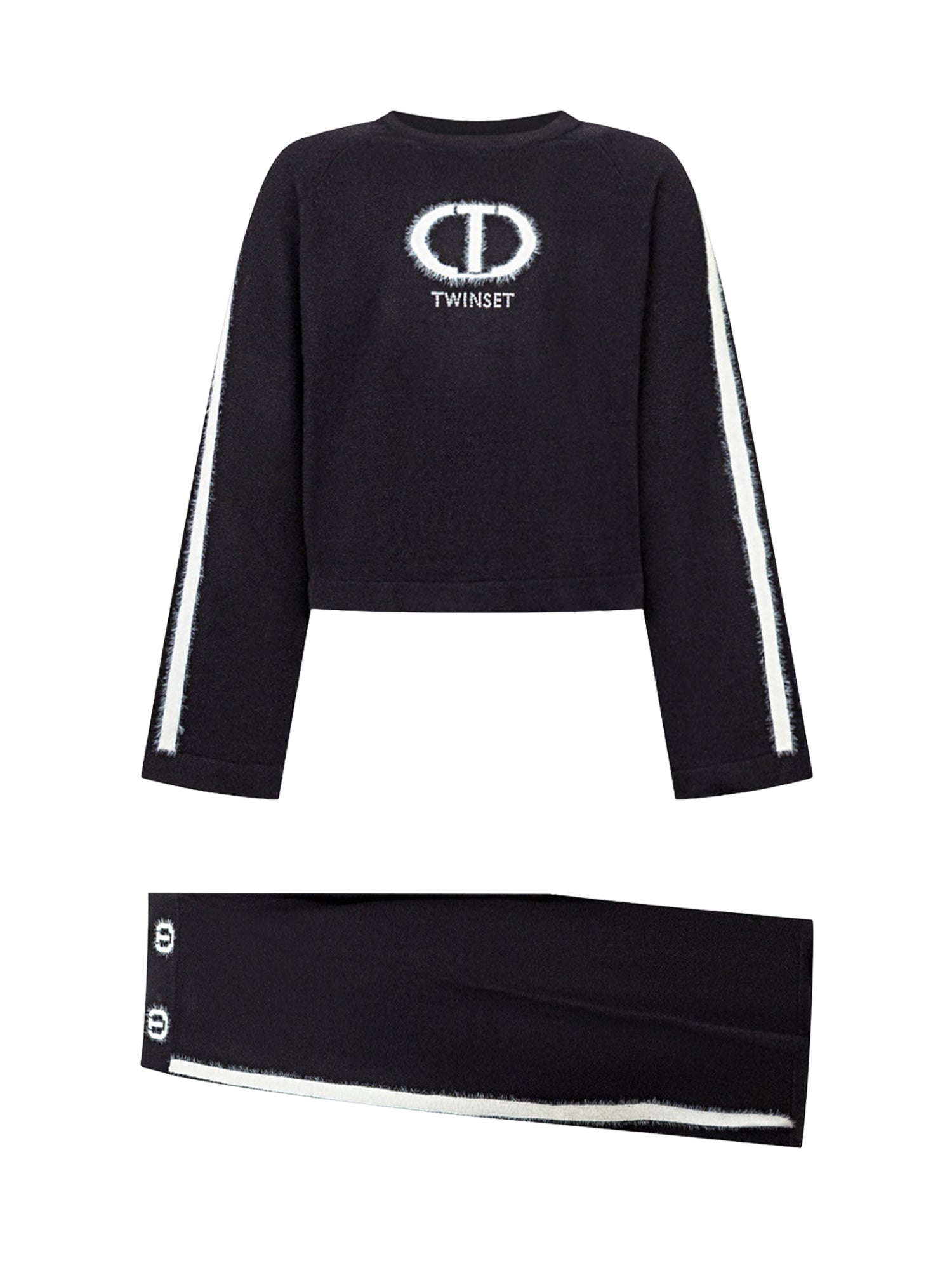 Twinset girls set featuring cropped top and matching skirt. Black with contrast logo and white details.