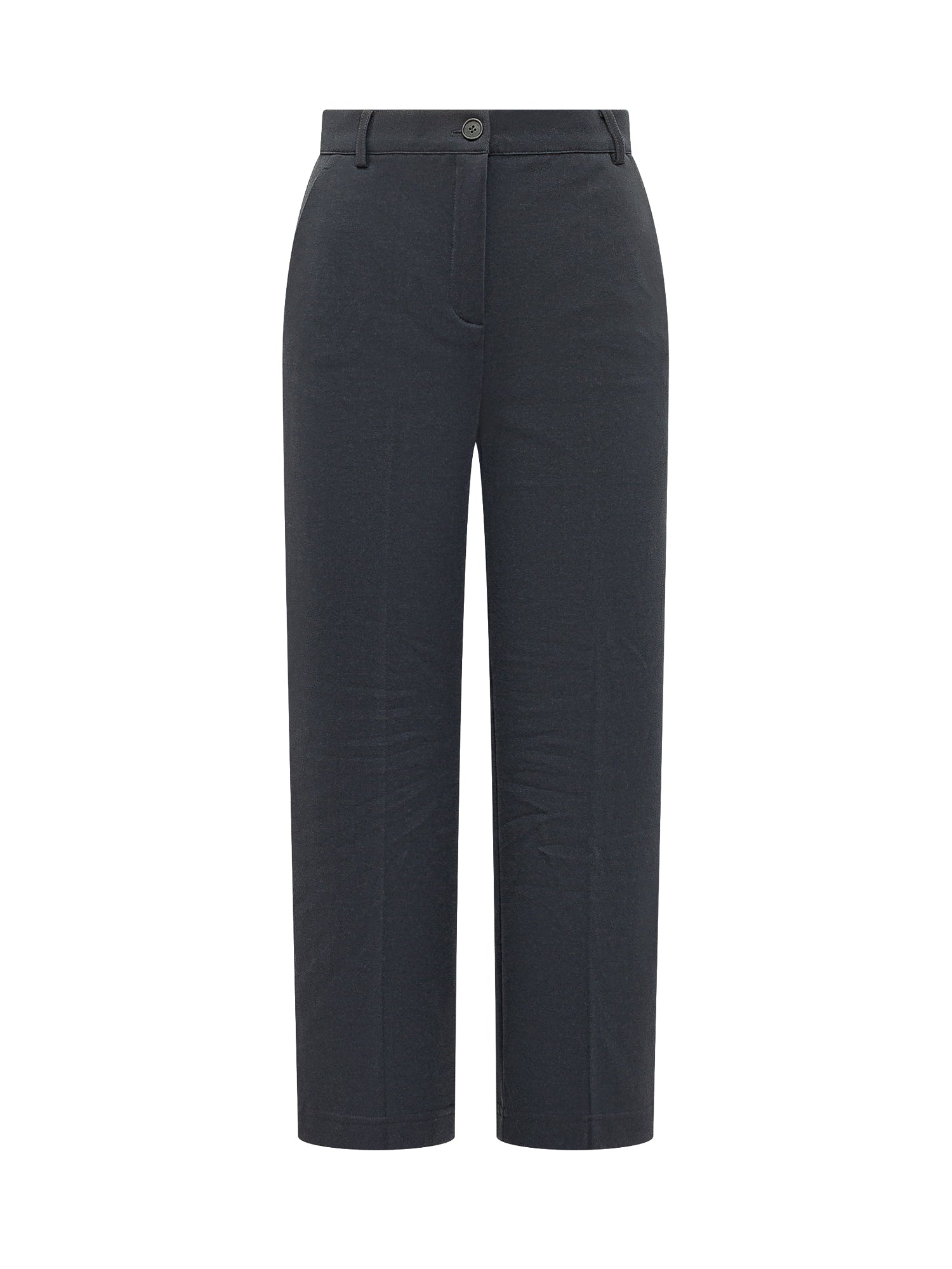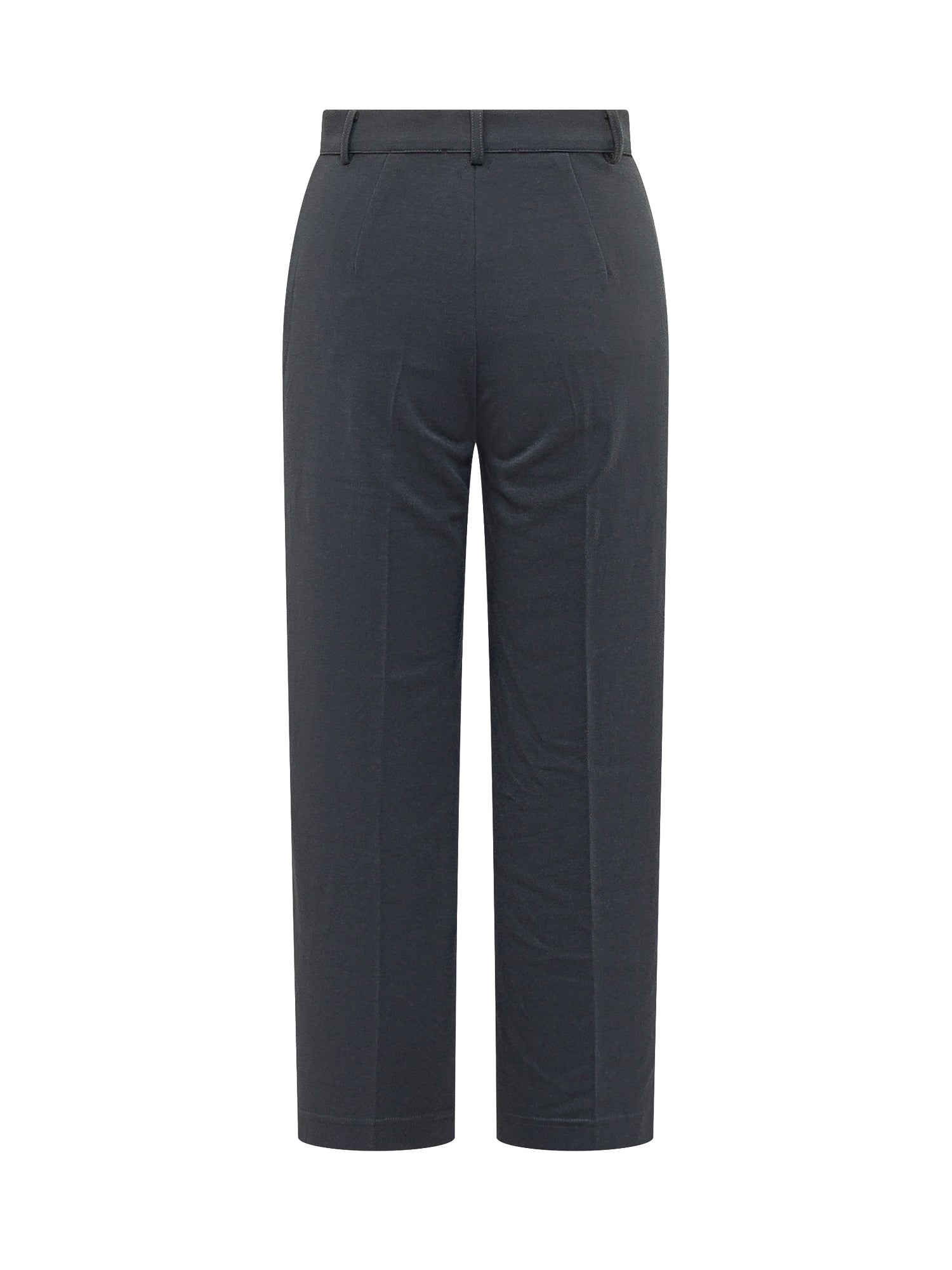 High waist trousers, straight leg, front button and zip closure, belt loops.