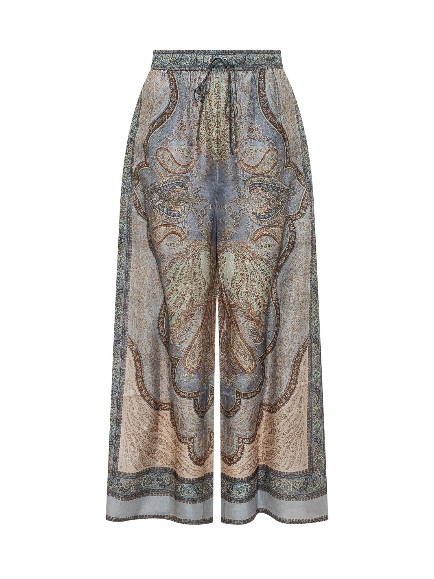 Flowy wide-leg pants featuring a paisley print in dusty blue and soft sage tones, finished with an elasticated drawstring waist and an airy drape for an elevated, comfortable boho look.