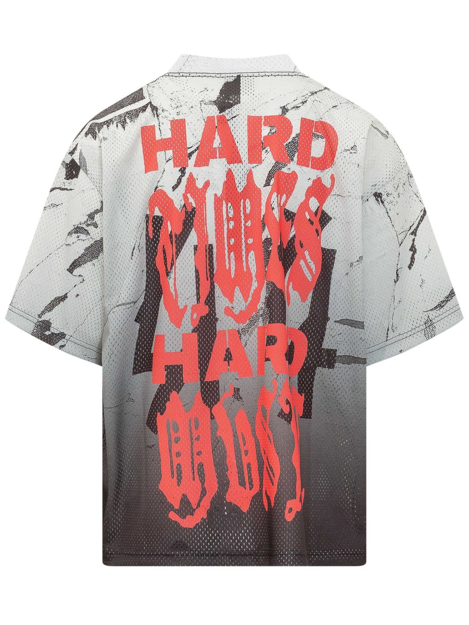 Mesh soccer style tee, short sleeves and crew neck, lettering print on the front and large on the back.