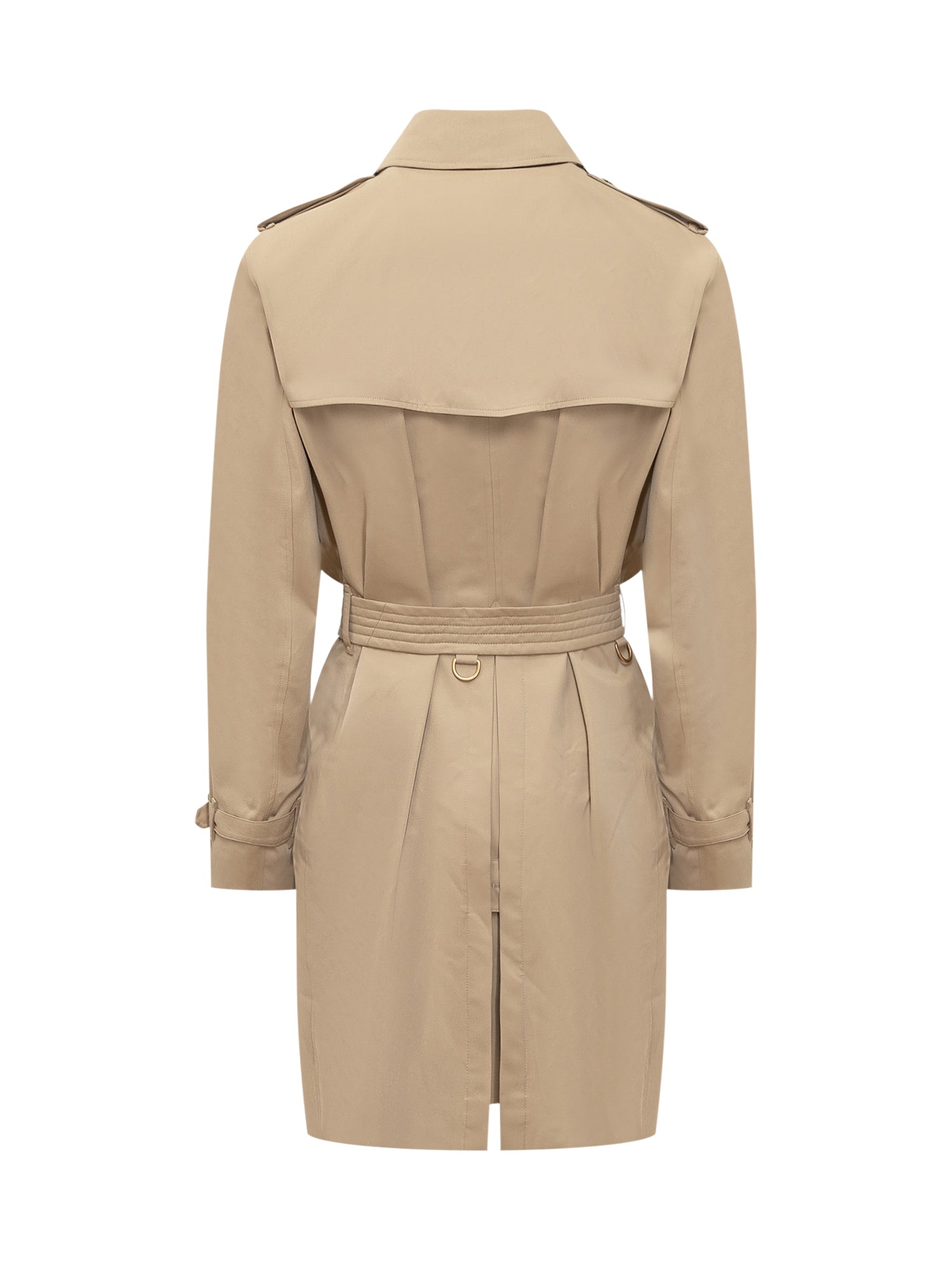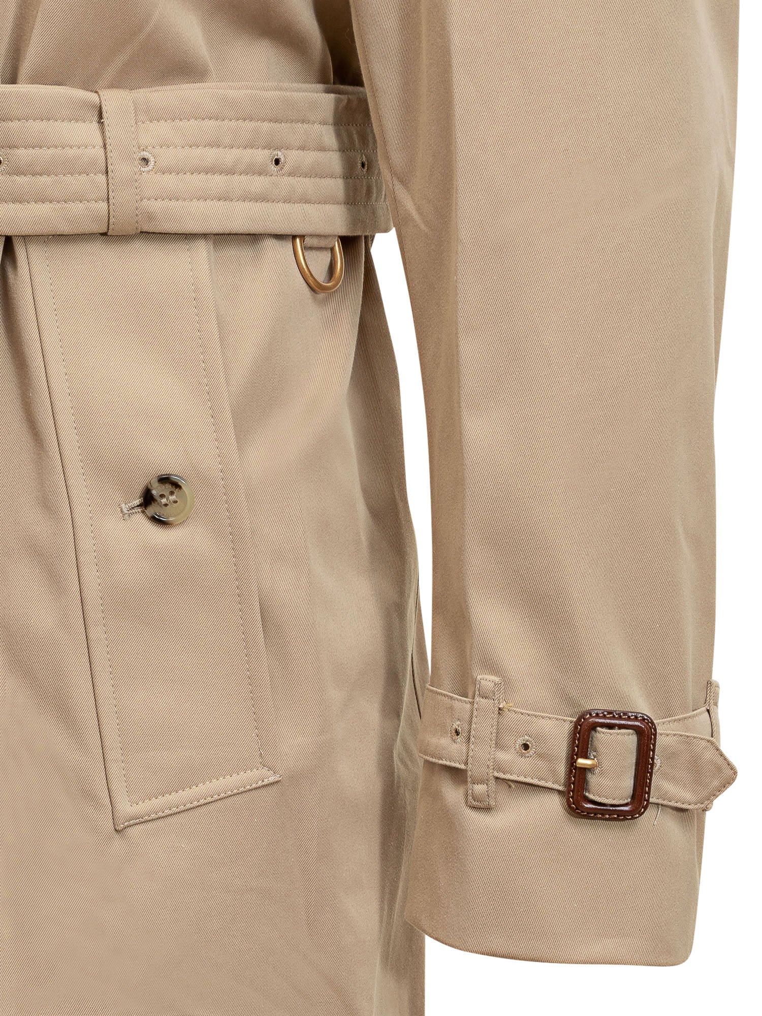 Cotton trench coat. Classic collar. Double-breasted closure with buttons and belt. Adjustable straps on the cuffs. Two pockets with button on the front. Slit in the back.