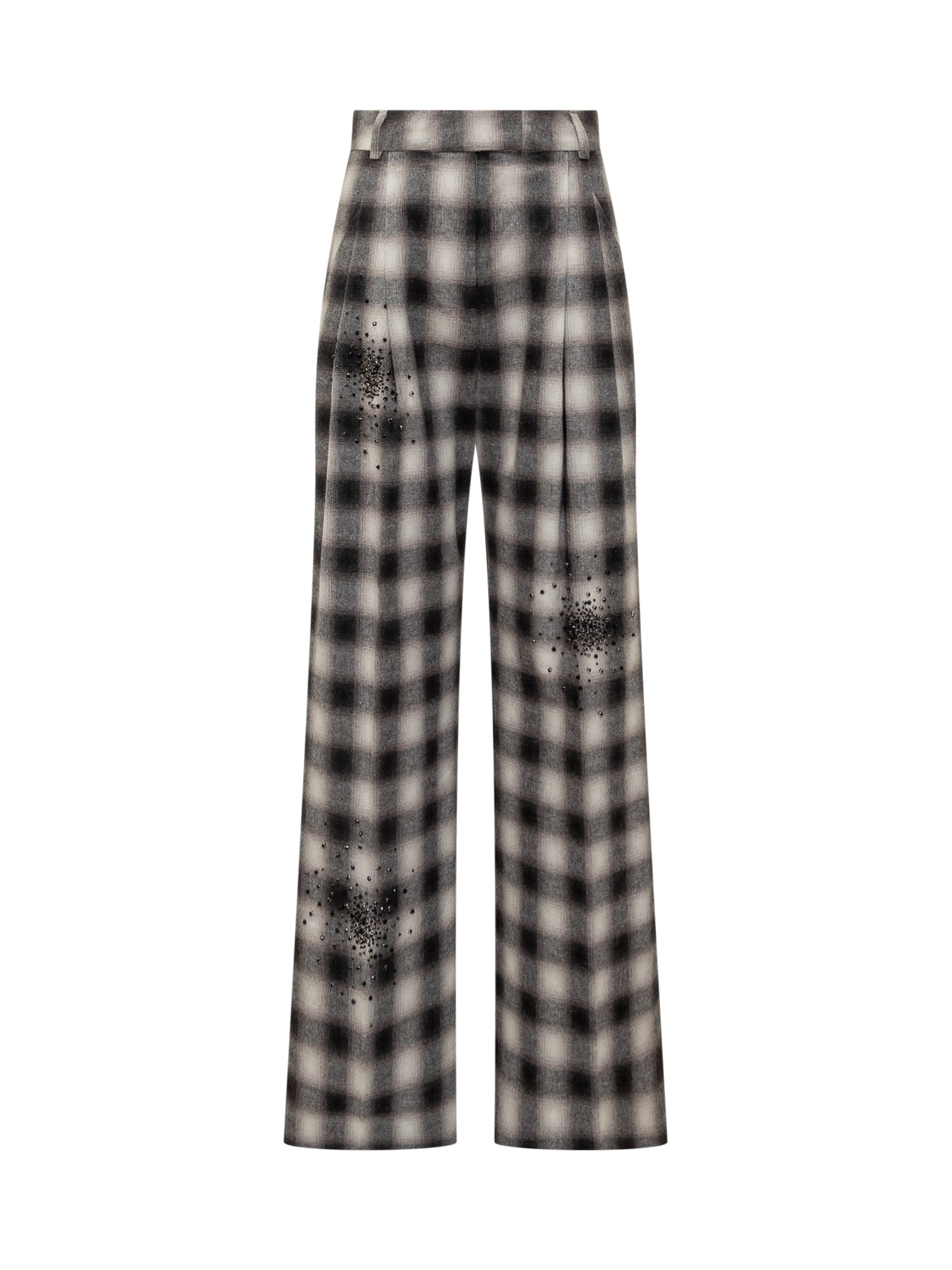 Wide-leg Des Phemmes pants in black and white check fabric with crystal embellishments.