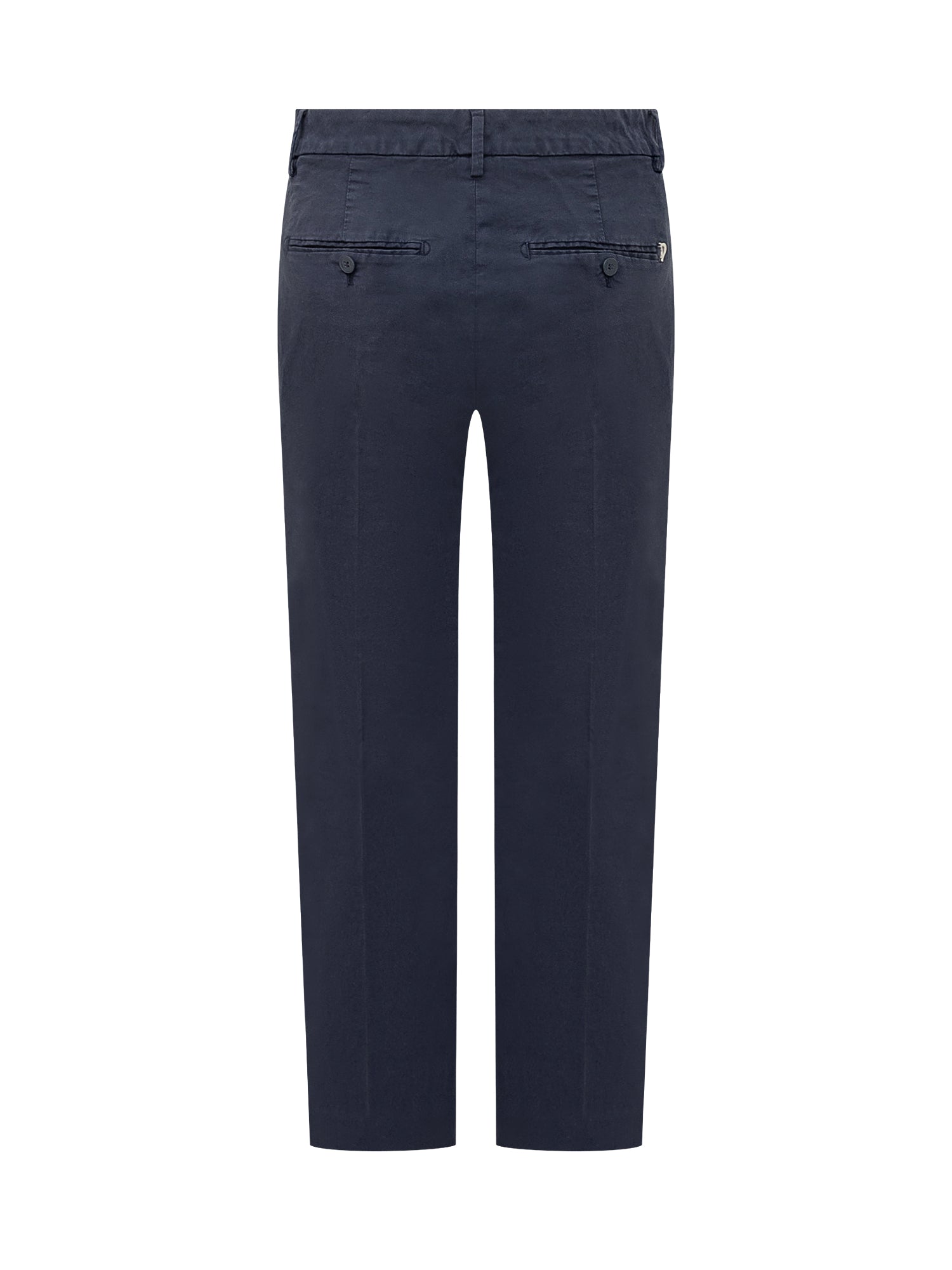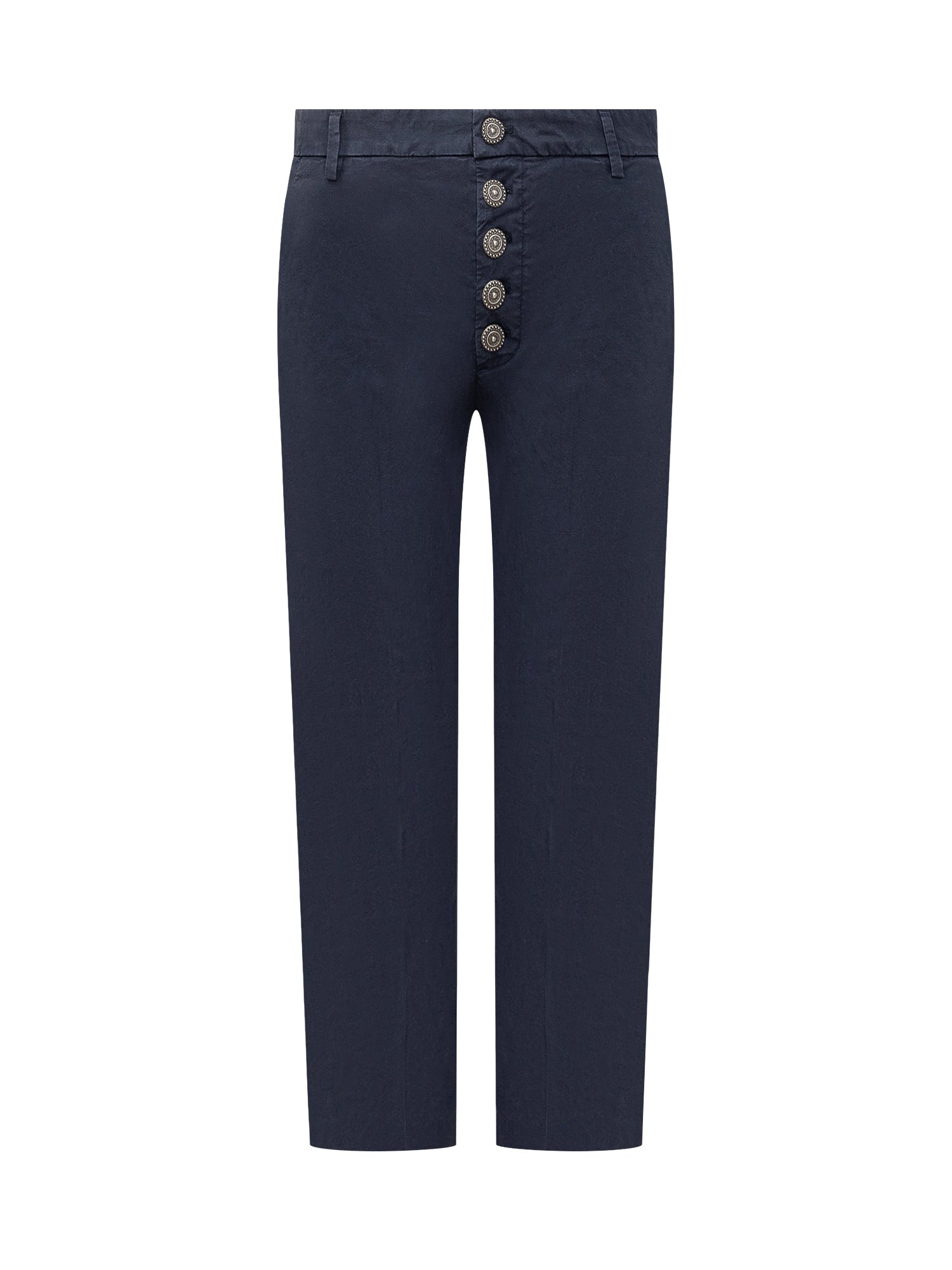 Closure with jewel buttons. Flush pockets on the sides. Flush pockets on the back with buttons. Belt straps.