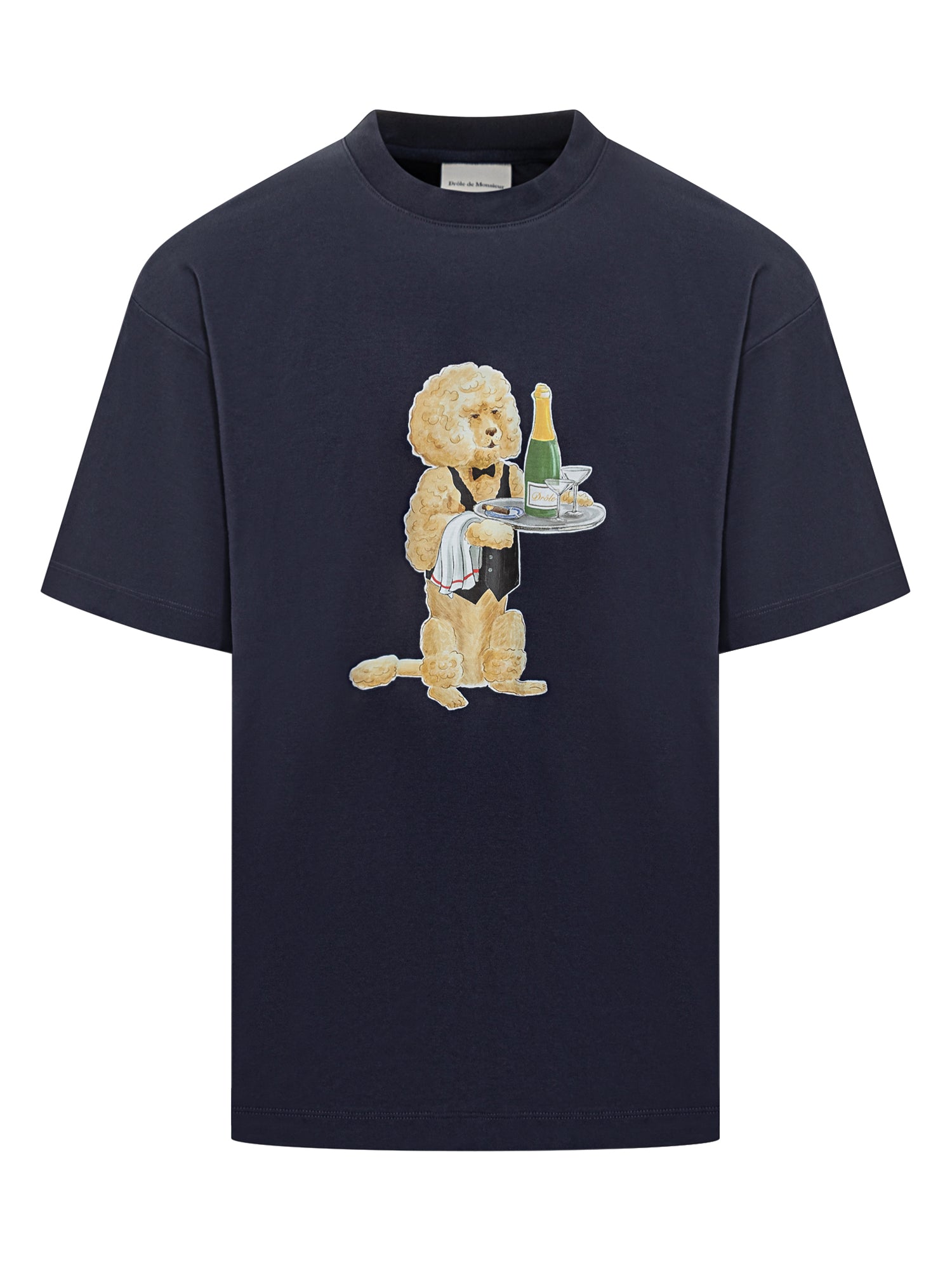Drole de Monsieur blue cotton T-shirt with dog waiter and champagne print.