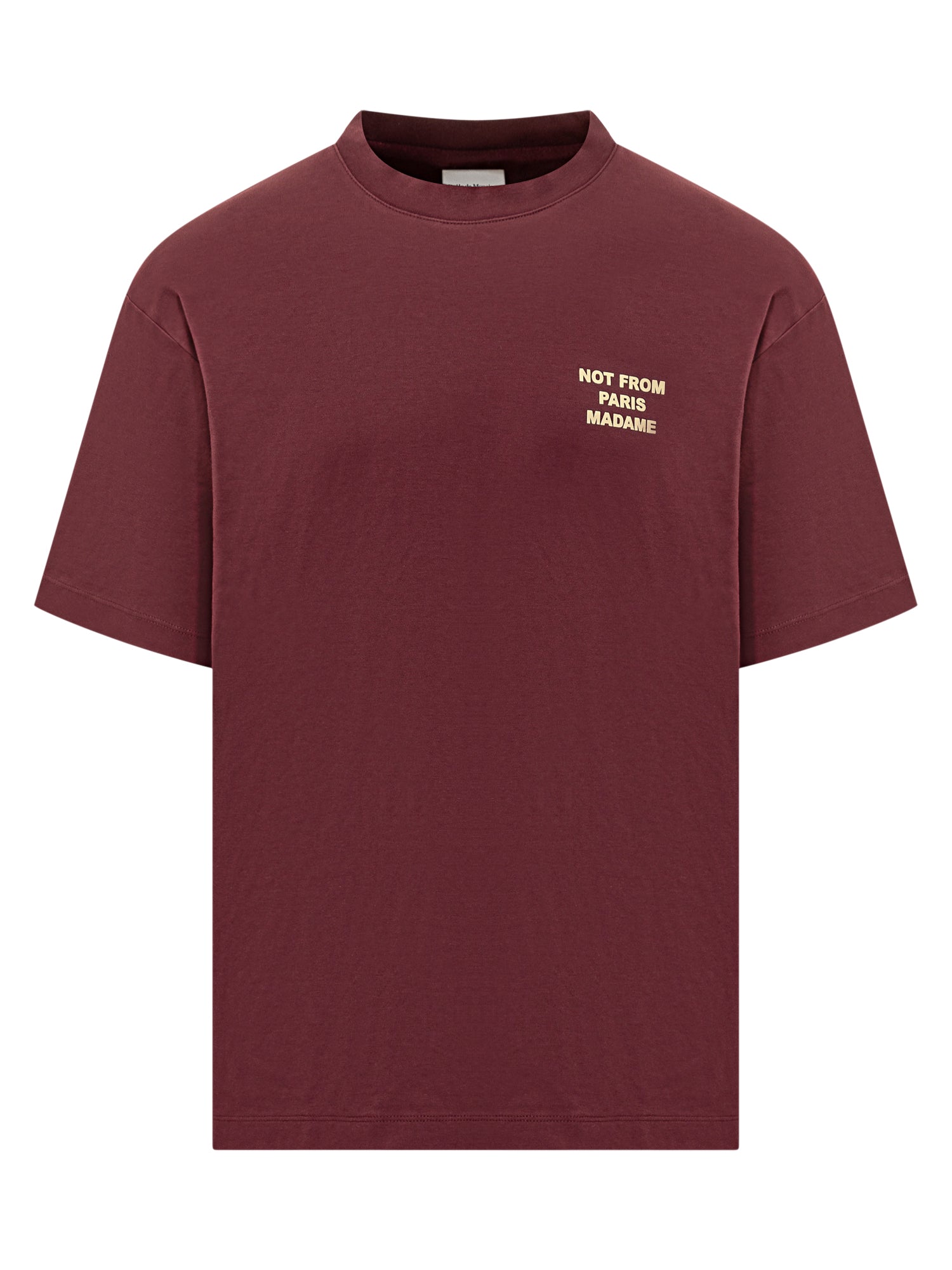 Drole de Monsieur cotton T-shirt in bordeaux with Not From Paris Madame front print.