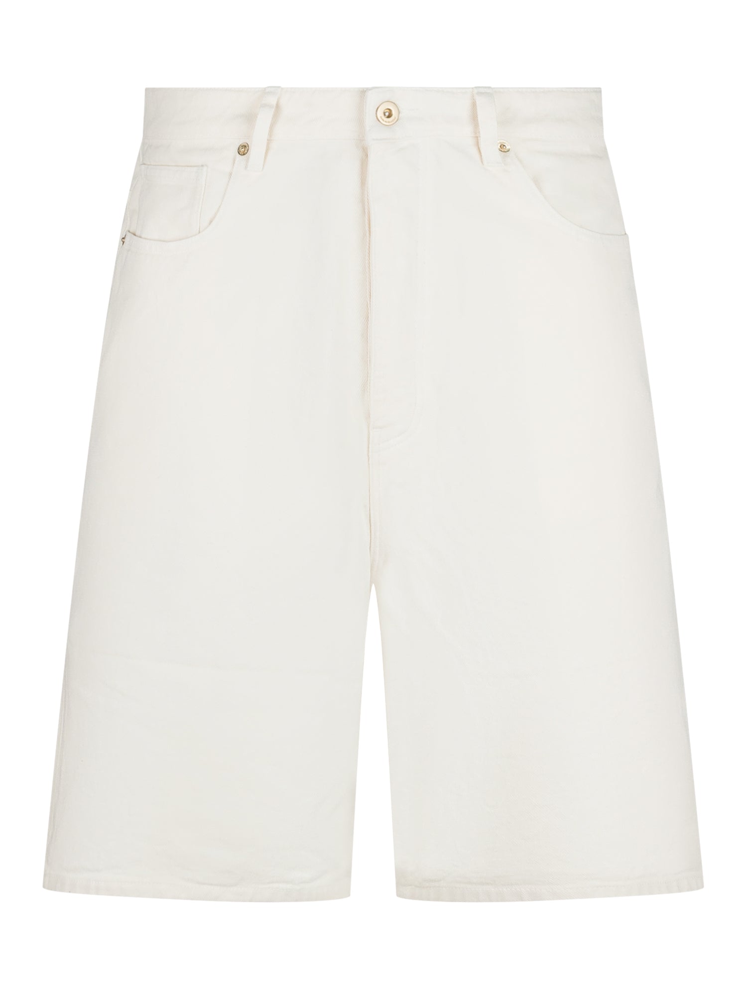 Shorts in jeans. Closure with buttons. Belt loops. Five pockets. Logo tag on the back.