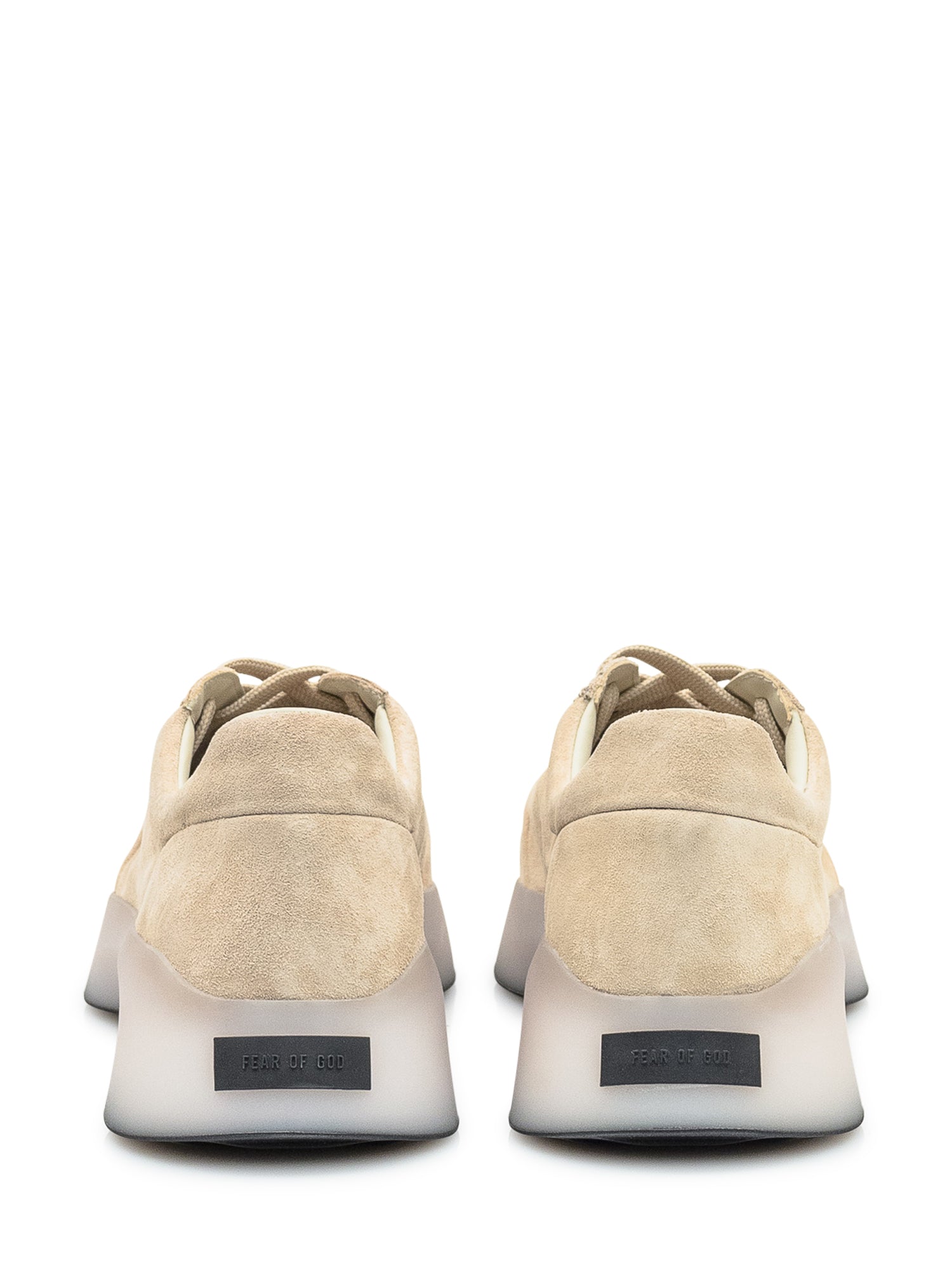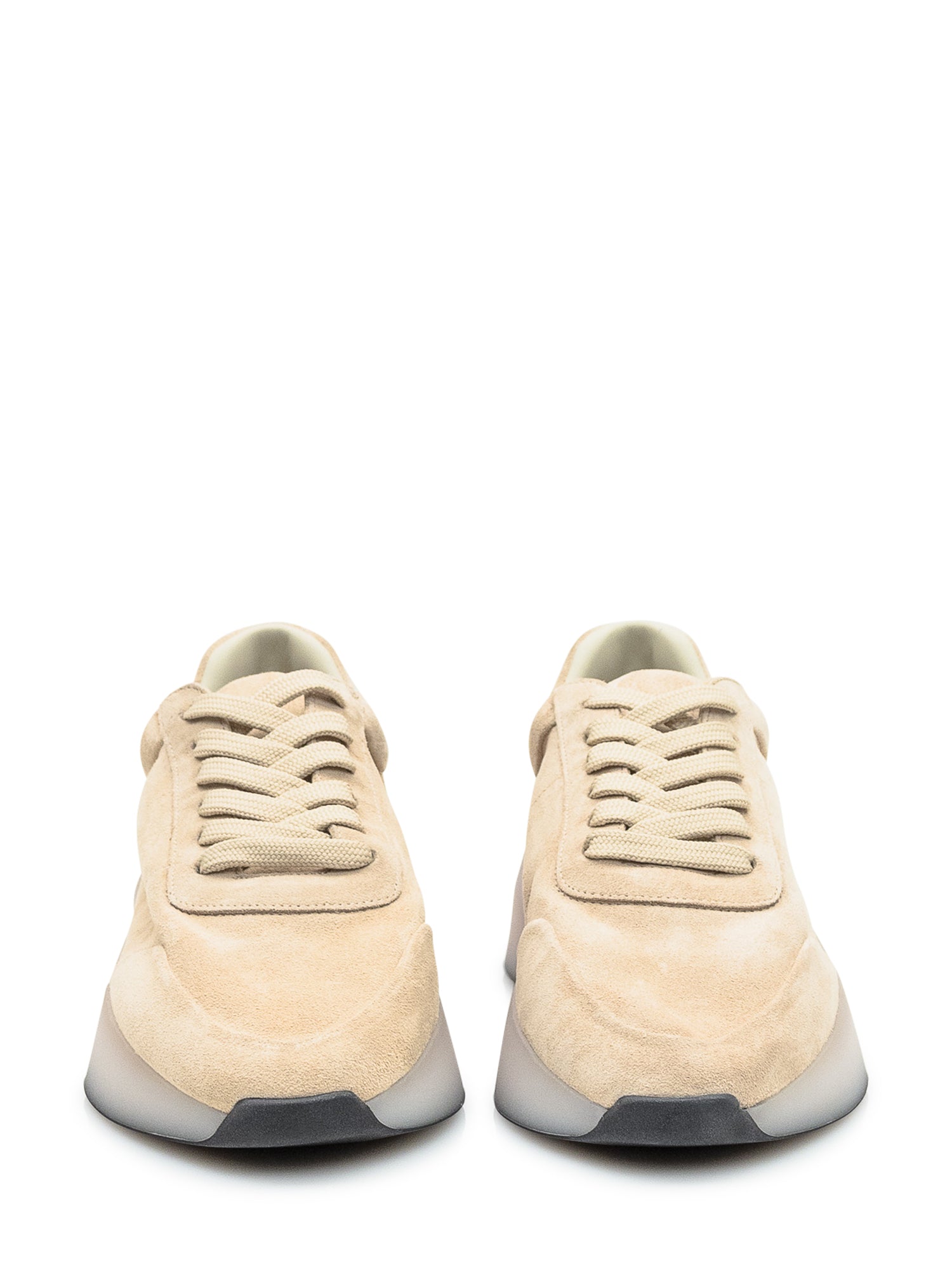 Fear of God Vintage Runner sneakers in soft beige suede with oversized rubber sole. Clean lines and retro silhouette.