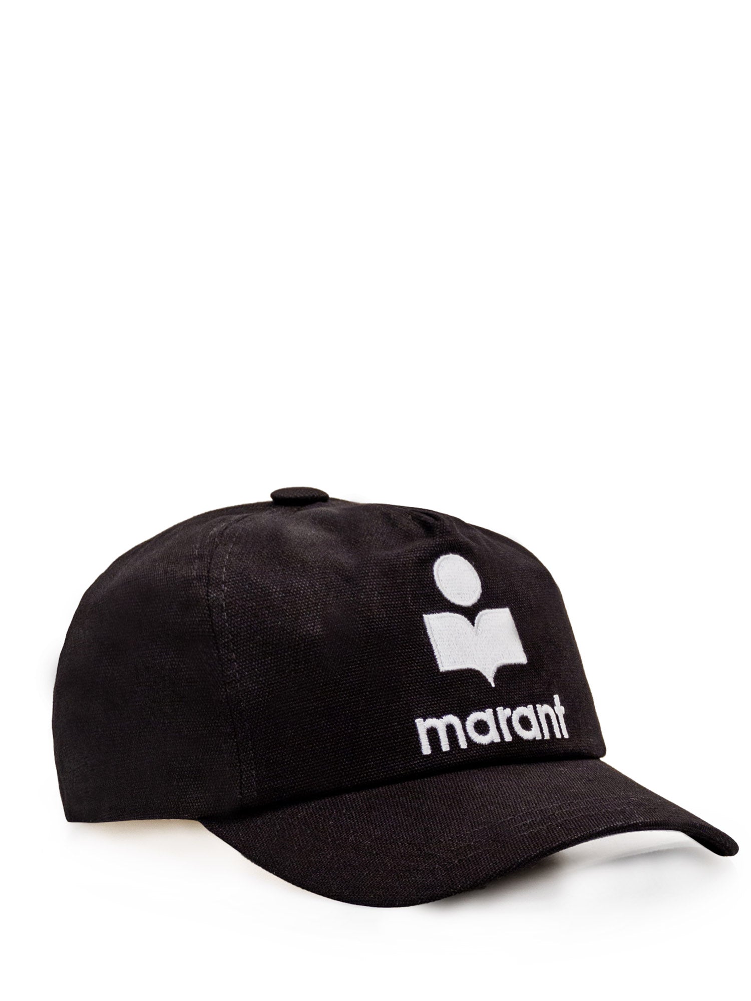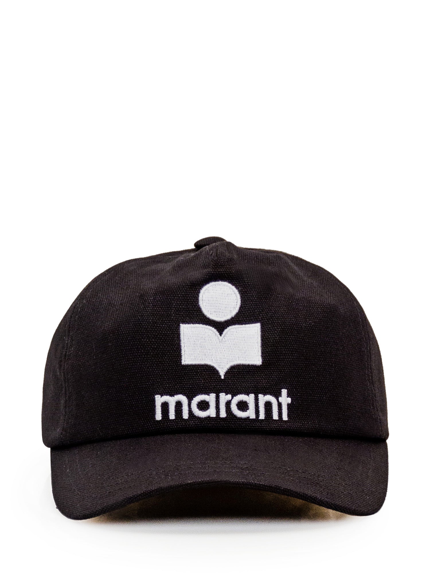 Black hat with curved cotton visor. Strap with strap on the back. Embroidered logo on the front.