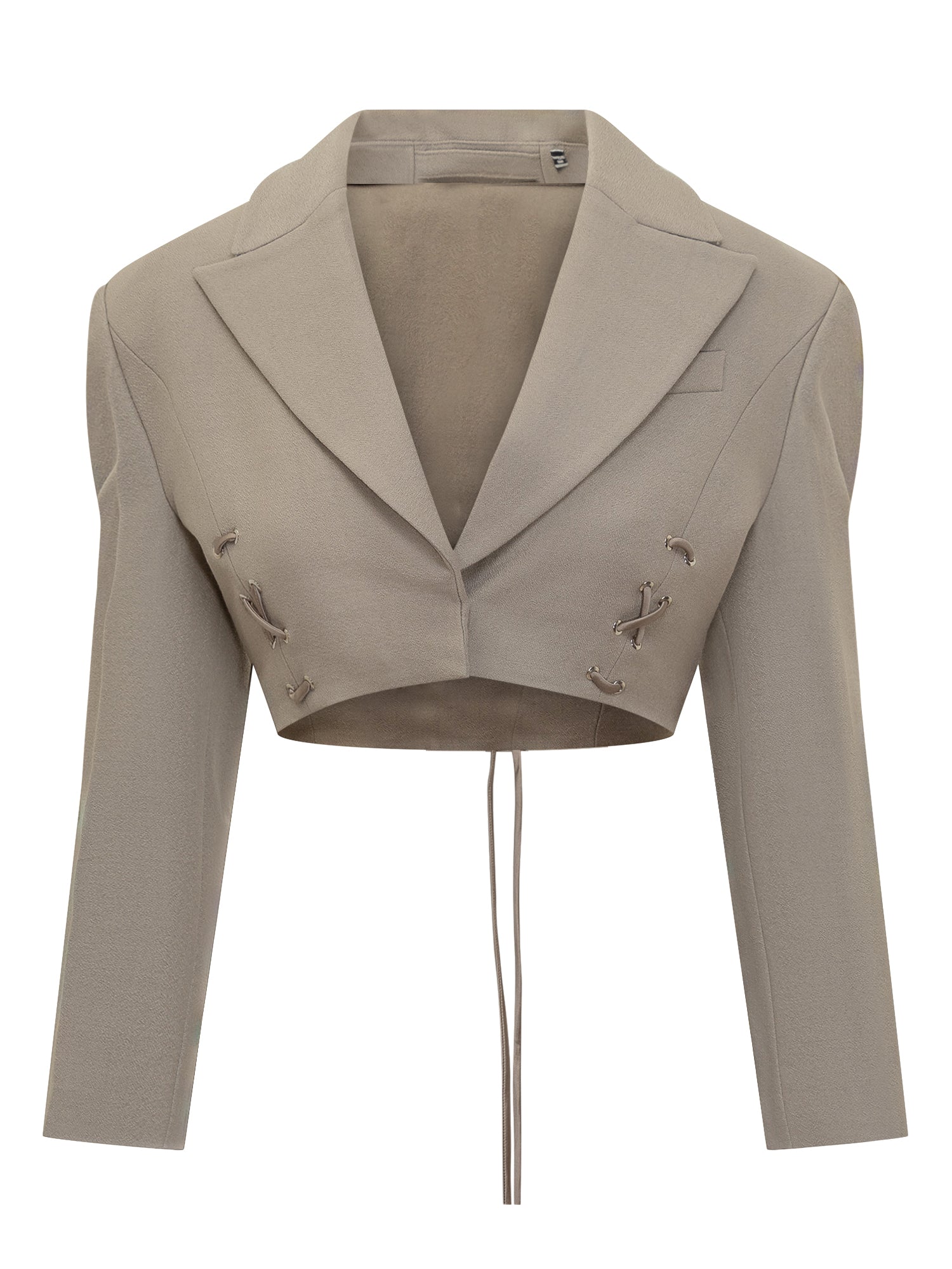 Marella Co-Design cropped beige jacket with classic lapel, hook closure and side lace-up details.