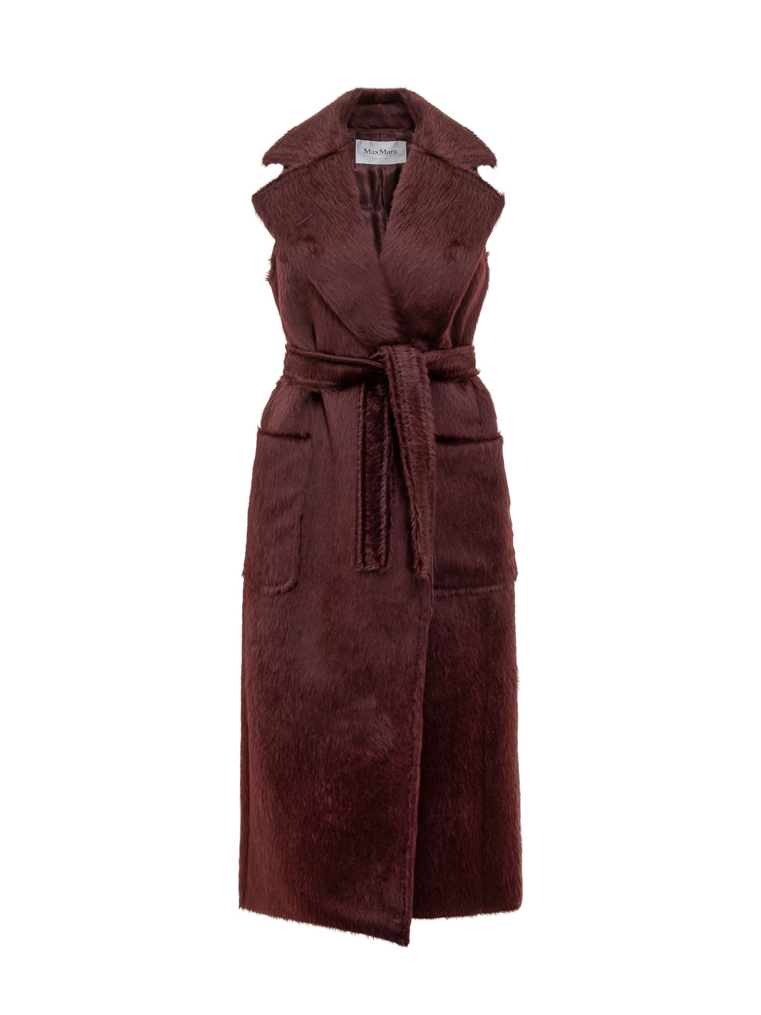 Max Mara long bordeaux wool vest with wide lapels, patch pockets and matching waist belt.