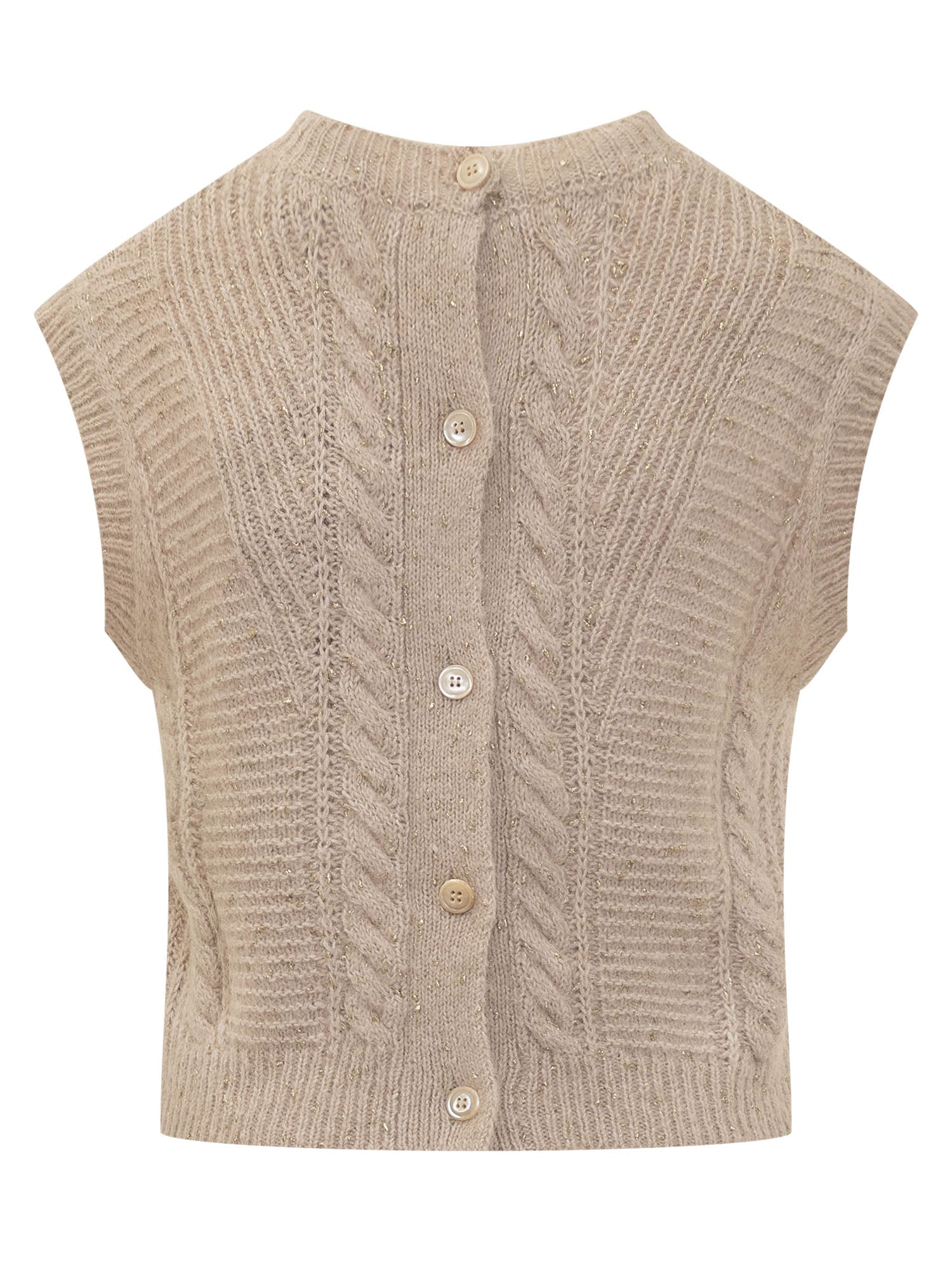 Max Mara Studio vest in beige wool with cable knit and metallic details.